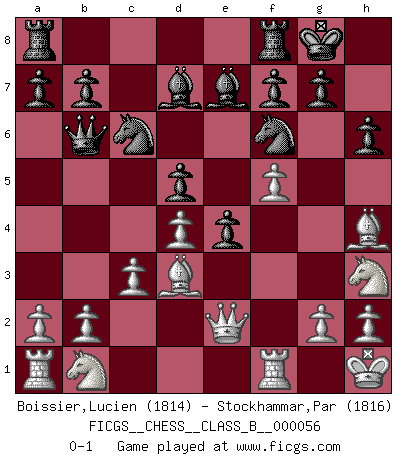 Last move : 0-1 2008 December 21 3:18:20 [Event "FICGS__CHESS__CLASS_B__000056"] [Site "FICGS"] [Date "2008.09.10"] [Round "1"] [White "Boissier,Lucien"] [Black "Stockhammar,Par"] [Result "0-1"] [WhiteElo "1814"] [BlackElo "1816"] 1.d4 Nf6 2.Bg5 e6 3.e3 c5 4.c3 cxd4 5.exd4 Nc6 6.Bd3 h6 7.Bh4 Qb6 8.Qe2 d5 9.Nh3 Be7 10.O-O O-O 11.f4 Bd7 12.f5 e5 13.Kh1 e4 0-1 This chess game has been lost on time (started : 2008.09.10 17:28:11) Trompowsky attack (Ruth, Opovcensky Opening) Kingside Castling by player White (move 10) Kingside Castling by player Black (move 10) Player Black won this chess game. Follow this game move after move (download)Without error there can be no brilliancy. (Emanuel Lasker) Ich weiss nicht was Gott gegen mich auf 1.e4 antworten würde. (Robert James Fischer) Puntos débiles o agujeros en la posición de tu oponente deben de ser ocupados por piezas, no Peones. (Siegbert Tarrasch) Des combinaisons [dans le jeu d'échecs] pareilles à des mélodies. Je crois entendre pour ainsi dire la musique des coups... (Vladimir Nabokov) Gambling is the son of avarice and the father of despair. (French proverb)