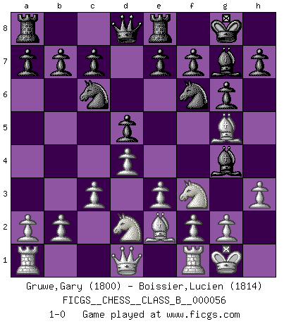 Last move : 1-0 2008 November 3 11:28:29 [Event "FICGS__CHESS__CLASS_B__000056"] [Site "FICGS"] [Date "2008.09.10"] [Round "1"] [White "Gruwe,Gary"] [Black "Boissier,Lucien"] [Result "1-0"] [WhiteElo "1800"] [BlackElo "1814"] 1.d4 Nf6 2.Nf3 g6 3.Bg5 Bg7 4.Nbd2 d5 5.e3 O-O 6.Be2 Re8 7.O-O Nc6 8.c3 Bg4 9.h3 1-0 King's Indian : Torre attack Kingside Castling by player Black (move 5) Kingside Castling by player White (move 7) Player White won this chess game. Follow this game move after move (download)In the perfect Chess combination as in a first-rate short story, the whole plot and counter-plot should lead up to a striking finale, the interest not being allayed until the very last moment. (Yates and Winter) Smyslow ist ein Beweis dafür, dass ich noch zehn Jahre spielen kann! [der 75 jährige über den 85 jährigen] (Viktor Kortschnoi) Creo que una cierta cantidad de temperamento es esperada de los genios del Ajedrez. (Ron Gross) Shah mat. Le roi est mort. Cri de fierté d'un joueur venant de terrasser son adversaire, courtoisement, sans effusion de sang. A good book on your shelf is a friend that turns its back on you and remains a friend. (Author unknown)