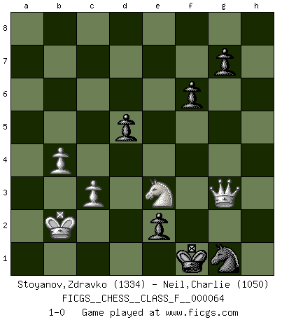 Last move : 1-0 2008 October 26 9:45:49 [Event "FICGS__CHESS__CLASS_F__000064"] [Site "FICGS"] [Date "2008.09.11"] [Round "1"] [White "Stoyanov,Zdravko"] [Black "Neil,Charlie"] [Result "1-0"] [WhiteElo "1334"] [BlackElo "1050"] 1.e4 c6 2.Nf3 d5 3.e5 e6 4.d4 Ne7 5.h3 c5 6.c3 Nbc6 7.Bg5 Qb6 8.b3 cxd4 9.Nxd4 h6 10.Nb5 Ng6 11.Nd6+ Bxd6 12.exd6 hxg5 13.b4 Nce5 14.a4 Qxd6 15.Na3 Bd7 16.Bb5 Nf4 17.O-O Nxh3+ 18.gxh3 g4 19.Re1 Rxh3 20.Kf1 Nf3 21.Ke2 Bxb5+ 22.Nxb5 Qe5+ 23.Kd3 Nxe1+ 24.Kd2 Rd3+ 25.Kc1 Rxd1+ 26.Kxd1 Nf3 27.Rc1 Qe1+ 28.Kc2 Qd2+ 29.Kb1 Ke7 30.Rc2 Qd1+ 31.Kb2 Rc8 32.Rc1 Qd2+ 33.Rc2 Qf4 34.Nxa7 Ne1 35.Nxc8+ Kf6 36.Re2 Qxf2 37.Rxf2+ Kg5 38.Nd6 f6 39.Nxb7 e5 40.Rf1 Nf3 41.a5 Kh4 42.a6 g3 43.Rh1+ Kg4 44.a7 g2 45.Ra1 g1Q 46.Rxg1+ Nxg1 47.a8Q e4 48.Nd6 e3 49.Qc8+ Kf4 50.Qf5+ Kg3 51.Qg6+ Kf2 52.Nf5 e2 53.Qg3+ Kf1 54.Ne3+ 1-0 Caro-Kann defense Kingside Castling by player White (move 17) Promotion Queen by player Black (move 45) Promotion Queen by player White (move 47) Player White won this chess game. Follow this game move after move (download)A passed Pawn increases in strength as the number of pieces on the board diminishes. (Capablanca) Ich bin stolz ein Bulgare zu sein. (Veselin Topalov) Todos los Maestros de Ajedrez fueron un día unos principiantes. (Chernev) Aucun coup ne doit être joué sans but. (Pedro Damiano) Whenever people agree with me, I always feel I must be wrong. (Oscar Wilde)