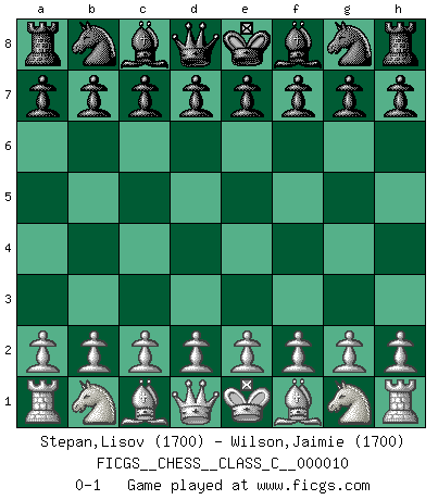 Last move : 0-1 2006 September 20 8:3:12 [Event "FICGS__CHESS__CLASS_C__000010"] [Site "FICGS"] [Date "2006.08.11"] [Round "1"] [White "Stepan,Lisov"] [Black "Wilson,Jaimie"] [Result "0-1"] [WhiteElo "1700"] [BlackElo "1700"] 0-1 This chess game has been lost on time (started : 2006.08.11 7:19:5) Player Black won this chess game. Follow this game move after move (download)Chess is life. (Bobby Fischer) Im Spitzenschach von heute geht es nur um Vorbereitung, um tiefgründige, sorgfältige Eröffnungsvorbereitung. (Nigel Short) Un buen sacrificio es aquel que aunque no sea necesariamente sólido, deja a tu oponente aturdido y confuso. (Rudolph Spielmann) La victoire dans une partie d'Echecs appartient la plupart du temps à celui qui voit un peu plus loin que l'adversaire. (Lasker) Fear is the path to the dark side. Fear leads to anger; anger leads to hate; hate leads to suffering. I sense much fear in you. (Master Yoda in Star Wars ep.1)