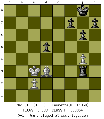 Last move : 0-1 2008 October 13 21:57:23 [Event "FICGS__CHESS__CLASS_F__000064"] [Site "FICGS"] [Date "2008.09.11"] [Round "1"] [White "Neil,Charlie"] [Black "Leurette,Marc-Antoine"] [Result "0-1"] [WhiteElo "1050"] [BlackElo "1360"] 1.e4 e5 2.Nf3 Nc6 3.d4 exd4 4.Nxd4 Bc5 5.Nxc6 Qf6 6.Be3 Bxe3 7.fxe3 Qxc6 8.Nc3 Nf6 9.e5 Ne4 10.Qd5 Nxc3 11.Qxc6 bxc6 12.bxc3 d6 13.exd6 cxd6 14.Bd3 O-O 15.O-O-O Be6 16.Rhg1 Bxa2 17.Kd2 Be6 18.Ba6 Rab8 19.Ke2 Rb6 20.Bd3 Bg4+ 21.Kd2 Bxd1 22.Rxd1 Ra8 23.Bc4 d5 24.Be2 a5 25.Ra1 a4 26.c4 a3 27.cxd5 cxd5 28.Bd3 Rh6 29.h3 Rf6 30.Kc3 Rf2 31.g4 Rf3 32.Kb3 Rxh3 33.Rxa3 Rxa3+ 34.Kxa3 Rxe3 35.Kb3 g6 36.Kc3 Rg3 0-1 Scotch game Kingside Castling by player Black (move 14) Queenside Castling by player White (move 15) 10 pieces endgame at move 34 : White KBPP , Black KRPPPP WHITE : King + 1 Bishop 2 Pawns BLACK : King + 1 Rook 4 Pawns Player Black won this chess game. Follow this game move after move (download)I won't play with you anymore. You have insulted my friend. - When an opponent cursed himself for a blunder. (Miguel Najdorf) Warum muß ich gegen diesen IDIOTEN verlieren? (Aaron Nimzowitsch) El Ajedrez moderno está demasiado preocupado con cosas como la estructura de Peones. Olvidenlo, el Jaque Mate termina la partida. (Nigel Short) Vous m'avez demandé de vous exposer quel est le fondement de la prière. Je ne fais que préparer les pièces du jeu sur la table... Nous sera-t-il permis d'en adopter les règles et si nous les appliquons scrupuleusement nous ne tarderons pas à faire mat le Roi divin ! Il ne pourra échapper à nos mains. (Sainte Thérèse d'Avila, Chemin de perfection) I would love to change the world, but they won't give me the source code. (Unknown)