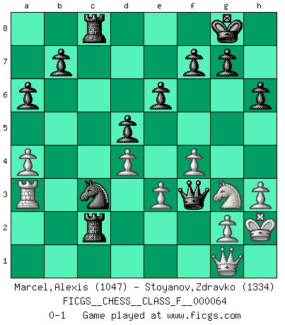 Last move : 0-1 2008 September 18 11:2:46 [Event "FICGS__CHESS__CLASS_F__000064"] [Site "FICGS"] [Date "2008.09.11"] [Round "1"] [White "Marcel,Alexis"] [Black "Stoyanov,Zdravko"] [Result "0-1"] [WhiteElo "1047"] [BlackElo "1334"] 1.f4 c6 2.Nf3 e6 3.e3 a6 4.Be2 Nf6 5.b3 d5 6.Bb2 Be7 7.O-O O-O 8.h3 Nbd7 9.d3 Bc5 10.Qd2 Re8 11.b4 Bd6 12.a3 Nh5 13.Nd4 Ng3 14.Rf3 Nxe2+ 15.Nxe2 Nf6 16.Nbc3 c5 17.bxc5 Bxc5 18.d4 Bb6 19.Raf1 h6 20.Na4 Ba5 21.Bc3 Bxc3 22.Naxc3 Qa5 23.a4 Bd7 24.Ra1 Rac8 25.Ra3 Ne4 26.Qe1 Bb5 27.Qa1 Bxe2 28.Nxe2 Rxc2 29.Ng3 Rec8 30.Kh2 Qd2 31.Qg1 Nc3 32.Nf1 Qe2 33.Ng3 Qxf3 0-1 Bird's Opening Kingside Castling by player White (move 7) Kingside Castling by player Black (move 7) Player Black won this chess game. Follow this game move after move (download)An attack on the wing should be met by play in the center. (Nimzovitch) Garry Kasparov war erst in der Großmeister-Organisation GMA, dann in der Profischach-Vereinigung PCA, zum Schluss kehrte er wieder in den Schoß der FIDE zurück. Aber gut, manche Leute sind flexibel (Viswanathan Anand) El Ajedrez es un terrible juego. Si no controlas el centro, tu oponente tiene una posición mas holgada. Si tienes control del centro, ¡entonces realmente tu tienes algo de que preocuparte!. (Siegbert Tarrasch) Un journaliste : 'Vous préférez avoir une dame de plus sur l'échiquier ou au lit ?' Boris Spassky : 'Ca dépend de la position.' There is far too much law for those who can afford it and far too little for those who cannot. (Derek Bok)