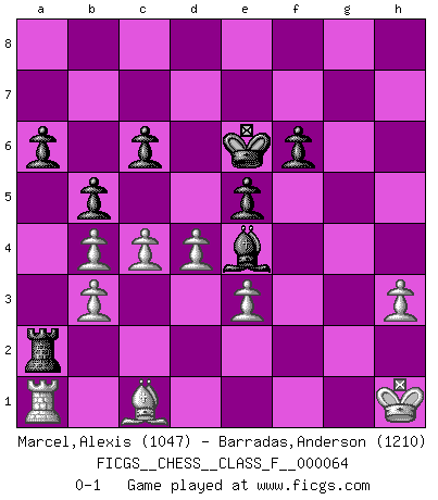 Last move : 0-1 2008 September 23 23:19:57 [Event "FICGS__CHESS__CLASS_F__000064"] [Site "FICGS"] [Date "2008.09.11"] [Round "1"] [White "Marcel,Alexis"] [Black "Barradas,Anderson"] [Result "0-1"] [WhiteElo "1047"] [BlackElo "1210"] 1.f4 Nc6 2.Nf3 d6 3.e3 e5 4.Be2 Nf6 5.fxe5 dxe5 6.O-O Bd6 7.b3 O-O 8.Bb2 Re8 9.h3 Nh5 10.Nh2 Nf6 11.Nc3 Be6 12.Ng4 a6 13.Nxf6+ gxf6 14.Qe1 Kh8 15.Ne4 Be7 16.Qf2 Rg8 17.Nxf6 Bxf6 18.Qxf6+ Qxf6 19.Rxf6 Kg7 20.Rf3 f6 21.Raf1 Raf8 22.Bd3 Nb4 23.Rg3+ Kf7 24.Rxg8 Rxg8 25.Be4 c6 26.a3 Bd5 27.Bxh7 Rxg2+ 28.Kh1 Rg7 29.Kh2 Rxh7 30.axb4 Ke6 31.c4 Be4 32.d4 b5 33.Ra1 Rg7 34.Bc1 Rg2+ 35.Kh1 Ra2 0-1 Bird's Opening Kingside Castling by player White (move 6) Kingside Castling by player Black (move 7) Player Black won this chess game. Follow this game move after move (download)A good player is always lucky. (Jose Raul Capablanca) Wenn Du absolut nicht mehr weißt, was Du tun sollst, dann ist es Zeit für Panik. (John van der Wiel) La pasion por jugar al Ajedrez es una de las mas inexplicables en el mundo. (H.G. Wells) La vie et les Echecs sont tous les deux une lutte constante. (Lasker) Perseverance does not equal worthiness. Next time you want to get my attention, wear something fun. Low-riding jeans are hot. (Gregory House, House M.D.)