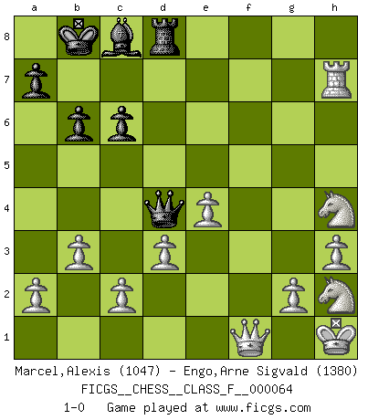 Last move : 1-0 2008 October 3 17:27:55 [Event "FICGS__CHESS__CLASS_F__000064"] [Site "FICGS"] [Date "2008.09.11"] [Round "1"] [White "Marcel,Alexis"] [Black "Engo,Arne Sigvald"] [Result "1-0"] [WhiteElo "1047"] [BlackElo "1380"] 1.f4 b6 2.Nf3 Bb7 3.e3 f5 4.Be2 Nf6 5.b3 d6 6.Bb2 Nbd7 7.O-O g6 8.h3 Bg7 9.d3 c6 10.Nbd2 Nh5 11.Bxg7 Rg8 12.Bb2 Qc7 13.Nh2 O-O-O 14.Bxh5 gxh5 15.Ndf3 e5 16.fxe5 dxe5 17.Nh4 Nf6 18.Rxf5 Nd7 19.e4 Rg5 20.Rxg5 Nf6 21.Bxe5 Qe7 22.Bxf6 Qxf6 23.Rxh5 Kb8 24.Qf3 Qxa1+ 25.Qf1 Qd4+ 26.Kh1 Bc8 27.Rxh7 1-0 Bird's Opening Kingside Castling by player White (move 7) Queenside Castling by player Black (move 13) Player White won this chess game. Follow this game move after move (download)Up to this point White has been following well-known analysis. But now he makes a fatal error: he begins to use his own head. (Siegbert Tarrasch) Wenn Du nicht kämpfst, um anderen etwas zu beweisen, sondern nur für Dich selbst, dann bist du fast unbesiegbar. (Garry Kasparov) El pensamiento metódico es mas útil en el Ajedrez que la inspiración. (C. J. S. Purdy) Lorsque vous vous retrouvez devant une position atroce, ne tendez pas un ultime piège dérisoire avec l'intention d'abandonner si l'adversaire le déjoue ! Faites-vous plutôt un devoir de résister comme si votre vie en dépendait. Jouez le coup qui vous déplairait au centuple si vous étiez dans la peau de votre tortionnaire ! The only sure thing about luck is that it will change. (Wilson Mizner)