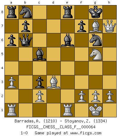 Last move : 1-0 2008 September 22 16:35:9 [Event "FICGS__CHESS__CLASS_F__000064"] [Site "FICGS"] [Date "2008.09.11"] [Round "1"] [White "Barradas,Anderson"] [Black "Stoyanov,Zdravko"] [Result "1-0"] [WhiteElo "1210"] [BlackElo "1334"] 1.e4 c6 2.d4 e6 3.Nf3 a6 4.Nc3 Bb4 5.Bd2 Ne7 6.Bd3 h6 7.d5 exd5 8.O-O dxe4 9.Bxe4 d5 10.Bd3 O-O 11.Re1 Be6 12.a3 Bc5 13.b4 Bd6 14.Qc1 c5 15.bxc5 Bxc5 16.Be3 d4 17.Bxh6 dxc3 18.Bxg7 Qb6 19.Qh6 Ng6 20.Ng5 Re8 21.Qh7+ 1-0 Caro-Kann defense Kingside Castling by player White (move 8) Kingside Castling by player Black (move 10) Player White won this chess game. Follow this game move after move (download)Becoming successful at Chess allows you to discover your own personality. That's what I want for the kids I teach. (Saudin Robovic) Ein Isolani verdüstert die Stimmung auf dem ganzen Schachbrett. (Savielly Grigorievitsch Tartakower) El Ajedrez es 99 por ciento táctica. (Teichmann) Il vaut toujours mieux jouer un plan faux de façon logique que de n'avoir pas de plan du tout. (Victor Kortchnoï) Macintosh - we might not get everything right, but at least we knew the century was going to end. (Douglas Adams)