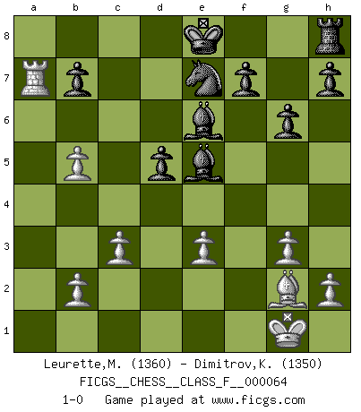 Last move : 1-0 2009 January 19 19:22:1 [Event "FICGS__CHESS__CLASS_F__000064"] [Site "FICGS"] [Date "2008.09.11"] [Round "1"] [White "Leurette,Marc-Antoine"] [Black "Dimitrov,Kiril"] [Result "1-0"] [WhiteElo "1360"] [BlackElo "1350"] 1.e4 e6 2.d3 c5 3.Nf3 Nc6 4.g3 g6 5.Bg2 Nge7 6.O-O Bg7 7.Nc3 d5 8.d4 cxd4 9.Nxd4 Bxd4 10.exd5 exd5 11.Nb5 Be5 12.Bh6 Nf5 13.Qd2 Qb6 14.a4 Nxh6 15.Qxh6 Be6 16.c3 a6 17.Qe3 Qxe3 18.fxe3 axb5 19.axb5 Rxa1 20.Rxa1 Ne7 21.Ra7 1-0 This chess game has been lost on time (started : 2008.09.11 15:38:5) French : King's Indian attack Kingside Castling by player White (move 6) Player White won this chess game. Follow this game move after move (download)Even the laziest King flees wildly in the face of a double check ! (Aaron Nimzowitsch) Fischer machte Schach einfach zu einer aufregenden Sache, wann immer er sich ans Brett setzte. (Raymond Keene) Todos los Maestros de Ajedrez fueron un día unos principiantes. (Chernev) Je ne suis pas le dernier à jouer lâchement des coups douteux pendant le zeïtnot de l'adversaire pour l'achever: en effet les coups qui font le plus peur sont ceux que l'on ne comprend pas. Je me fais souvent peur quand je joue. (Un professeur anonyme) Every now and then a man's mind is stretched by a new idea and never shrinks back to its former dimensions. (Oliver Wendell Holmes, Sr.)