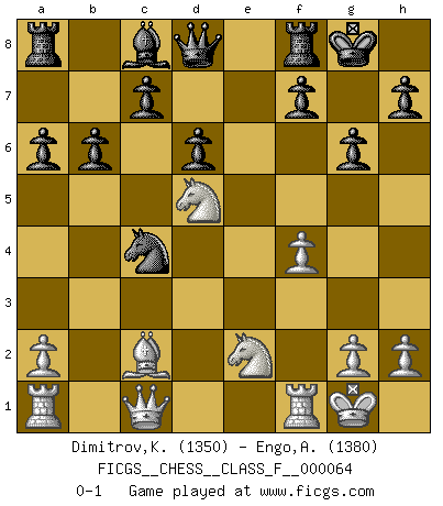 Last move : 0-1 2009 January 16 18:59:4 [Event "FICGS__CHESS__CLASS_F__000064"] [Site "FICGS"] [Date "2008.09.11"] [Round "1"] [White "Dimitrov,Kiril"] [Black "Engo,Arne Sigvald"] [Result "0-1"] [WhiteElo "1350"] [BlackElo "1380"] 1.d4 Nf6 2.c4 g6 3.Nc3 Bg7 4.e4 d6 5.Bd3 O-O 6.Nge2 a6 7.O-O Nc6 8.Bc2 b6 9.Bg5 e5 10.dxe5 Nxe5 11.f4 Nxc4 12.e5 Nxb2 13.Qc1 Nc4 14.exf6 Bxf6 15.Bxf6 Qxf6 16.Nd5 Qd8 0-1 This chess game has been lost on time (started : 2008.09.11 15:38:5) King's Indian : 4.e4 Kingside Castling by player Black (move 5) Kingside Castling by player White (move 7) Player Black won this chess game. Follow this game move after move (download)Fischer was a master of clarity and a king of artful positioning. His opponents would see where he was going but were powerless to stop him. (Bruce Pandolfini) Ein Buch ist ein Spiegel; wenn ein Affe hineinsieht, so kann kein Apostel heraus gucken. (Georg Christoph Lichtenberg) Cada Peón es una Reina en potencia. (James Mason) Le succès, c'est être capable d'aller d'échec en échec sans perdre son enthousiasme. (Winston Churchill) Art is not a thing, it is a way. (Elbert Hubbard)