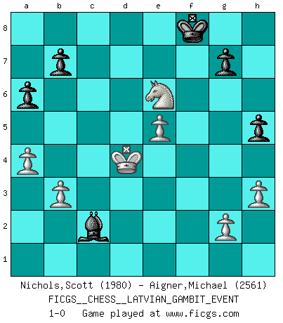 Last move : 1-0 2008 October 3 14:2:28 [Event "FICGS__CHESS__LATVIAN_GAMBIT_EVENT"] [Site "FICGS"] [Date "2008.09.12"] [Round "1"] [White "Nichols,Scott"] [Black "Aigner,Michael"] [Result "1-0"] [WhiteElo "1980"] [BlackElo "2561"] 1.e4 e5 2.Nf3 f5 3.Nxe5 Qf6 4.d4 d6 5.Nc4 fxe4 6.Nc3 Qg6 7.f3 Nc6 8.fxe4 Be7 9.Ne3 Nh6 10.Qd3 Bg5 11.Ned5 Bxc1 12.Rxc1 O-O 13.Qg3 Ng4 14.Be2 h5 15.Rd1 Qh6 16.Bxg4 Bxg4 17.Rd2 Rf7 18.Qe3 Qg6 19.Rf1 Raf8 20.Rxf7 Rxf7 21.Rf2 Rxf2 22.Qxf2 Qg5 23.Qd2 Qd8 24.b3 a6 25.h3 Be6 26.Qe3 Qd7 27.Nf4 Bf7 28.e5 dxe5 29.dxe5 Qd4 30.Qxd4 Nxd4 31.Kd2 Kf8 32.Kd3 Ne6 33.Nxe6+ Bxe6 34.Kd4 Bf5 35.Nd5 Bxc2 36.Nxc7 Bb1 37.a4 Bc2 38.Ne6+ 1-0 Latvian counter-gambit Kingside Castling by player Black (move 12) Player White won this chess game. Follow this game move after move (download)I played Chess with him and would have beaten him sometimes only he always took back his last move, and ran the game out differently. (Mark Twain) Wie bekannt hörte Morphy 1859 auf, Schach zu spielen. Seine Enttäuschung galt nicht so sehr dem Schach, wie den Schachspielern. (Robert James Fischer) ¿Porque tengo que perder ante este idiota?. (Aron Nimzovich) On peut tirer plus d'utilité d'une partie perdue que de 100 parties gagnées. (Capablanca) Establishing goals is all right if you don't let them deprive you of interesting detours. (Doug Larson)