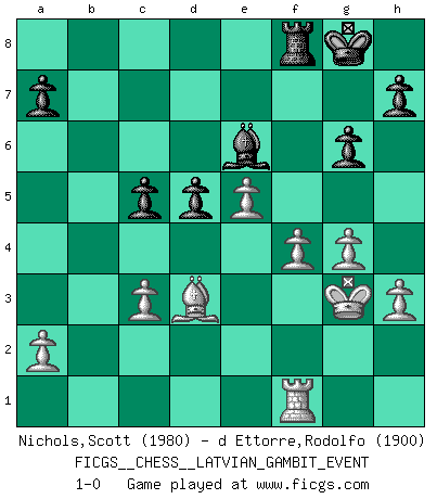 Last move : 1-0 2008 October 20 9:32:10 [Event "FICGS__CHESS__LATVIAN_GAMBIT_EVENT"] [Site "FICGS"] [Date "2008.09.12"] [Round "1"] [White "Nichols,Scott"] [Black "d Ettorre,Rodolfo"] [Result "1-0"] [WhiteElo "1980"] [BlackElo "1900"] 1.e4 e5 2.Nf3 f5 3.Nxe5 Qf6 4.d4 d6 5.Nc4 fxe4 6.Nc3 Qg6 7.f3 Be7 8.Nxe4 d5 9.Ne5 Qb6 10.Nc3 Nf6 11.Na4 Qe6 12.Be2 Nc6 13.f4 O-O 14.O-O Ne4 15.c4 Nxe5 16.dxe5 c6 17.cxd5 cxd5 18.Be3 Bd7 19.Rc1 Rac8 20.Nc3 Nxc3 21.Rxc3 Rxc3 22.bxc3 Qc6 23.Bd4 Bc5 24.g4 g6 25.h3 b6 26.Kg2 Qc8 27.Bxc5 Qxc5 28.Qd4 Bc8 29.Qxc5 bxc5 30.Kg3 Be6 31.Bd3 1-0 Latvian counter-gambit Kingside Castling by player Black (move 13) Kingside Castling by player White (move 14) Player White won this chess game. Follow this game move after move (download)That's what Chess is all about. One day you give your opponent a lesson, the next day he gives you one. (Bobby Fischer) Schach ist ein schwarz-weisser Dschungel. (Garry Kasparov) El Ajedrez es sobre todo, ¡una pelea!. (Emanuel Lasker) RxDa4 pat (...) Yoga is 99% practice and 1% knowledge. (Sri Krishna Pattabhi Jois)