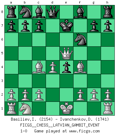 Last move : 1-0 2008 October 26 1:5:33 [Event "FICGS__CHESS__LATVIAN_GAMBIT_EVENT"] [Site "FICGS"] [Date "2008.09.12"] [Round "1"] [White "Basiliev,Iouri"] [Black "Ivanchenkov,Denis"] [Result "1-0"] [WhiteElo "2154"] [BlackElo "1741"] 1.e4 e5 2.Nf3 f5 3.Bc4 d6 4.d4 fxe4 5.Nxe5 dxe5 6.Qh5+ Kd7 7.Qf5+ Kc6 8.Qxe5 Nf6 9.Qb5+ Kd6 10.Bf4+ Ke7 11.Qe5+ 1-0 Latvian gambit, 3.Bc4 Player White won this chess game. Follow this game move after move (download)When you don't know what to play, wait for an idea to come into your opponent's mind. You may be sure that idea will be wrong. (Siegbert Tarrasch) Zeige mir drei Eröffnungsvarianten und ich beweise dir, dass zwei davon inkorrekt sind. (Emanuel Lasker) Solo existe una cosa que Fischer hace en el Ajedrez sin placer: ¡perder!. (Boris Spassky) La vie et les Echecs sont tous les deux une lutte constante. (Lasker) Art is the only way to run away without leaving home. (Twyla Tharp)