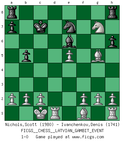 Last move : 1-0 2008 December 15 23:32:19 [Event "FICGS__CHESS__LATVIAN_GAMBIT_EVENT"] [Site "FICGS"] [Date "2008.09.12"] [Round "1"] [White "Nichols,Scott"] [Black "Ivanchenkov,Denis"] [Result "1-0"] [WhiteElo "1980"] [BlackElo "1741"] 1.e4 e5 2.Nf3 f5 3.Nxe5 Qf6 4.d4 d6 5.Nc4 Nc6 6.Nc3 Nge7 7.e5 dxe5 8.Nb5 Nd5 9.dxe5 Qe6 10.Qxd5 Qxd5 11.Nxc7+ Kd8 12.Nxd5 b5 13.Bg5+ Be7 14.Nxe7 Nxe7 15.Nd6 Be6 16.O-O-O h6 17.Nxf5 Kc7 18.Nxg7 1-0 Latvian counter-gambit Queenside Castling by player White (move 16) Player White won this chess game. Follow this game move after move (download)Don't even mention losing to me. I can't stand to think of it. (Bobby Fischer) Smyslow ist ein Beweis dafür, dass ich noch zehn Jahre spielen kann! [der 75 jährige über den 85 jährigen] (Viktor Kortschnoi) Fischer sacrificó virtualmente todo lo que la mayoría de nosotros los 'debiles' (término que él usa) valoramos, respetamos y apreciamos por el amor de un astuto, a menudo hermoso tablero de juego, por el privilegio ambivalente de ser su mas grande maestro. (Paul Kollar) Donnez-moi un Cavalier en 6e et je gagnerais toutes mes parties. (Steinitz) Hold em is to stud what chess is to checkers. (Johnny Moss)