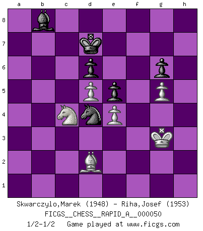 Last move : 1/2-1/2 2008 October 9 12:2:30 [Event "FICGS__CHESS__RAPID_A__000050"] [Site "FICGS"] [Date "2008.09.14"] [Round "1"] [White "Skwarczylo,Marek"] [Black "Riha,Josef"] [Result "1/2-1/2"] [WhiteElo "1948"] [BlackElo "1953"] 1.d4 Nf6 2.Nf3 g6 3.c4 Bg7 4.Nc3 O-O 5.e4 d6 6.Be2 e5 7.O-O Nc6 8.d5 Ne7 9.Nd2 a5 10.a3 Bd7 11.Rb1 a4 12.b4 axb3 13.Nxb3 b6 14.Ra1 Ne8 15.a4 f5 16.f3 Nf6 17.Be3 Nh5 18.a5 bxa5 19.Nxa5 Nf4 20.c5 Qb8 21.c6 Qb2 22.Bd2 Qb6+ 23.Kh1 Nxe2 24.Qxe2 Rxa5 25.cxd7 Rd8 26.Rxa5 Qxa5 27.Rc1 Rxd7 28.Qb5 Qxb5 29.Nxb5 Kf7 30.Ba5 fxe4 31.fxe4 Ng8 32.Rxc7 Ke8 33.g3 Bf8 34.Rc8+ Kf7 35.Kg2 Nf6 36.Kf3 Rb7 37.Rc7+ Rxc7 38.Bxc7 Ne8 39.Ba5 Ke7 40.Na3 Kd7 41.Nc4 Nf6 42.Bb4 Be7 43.g4 Ne8 44.Bd2 Nc7 45.g5 Nb5 46.h4 Nd4+ 47.Kg4 Bd8 48.h5 Bc7 49.Bb4 Nb3 50.hxg6 hxg6 51.Kg3 Nd4 52.Bd2 Bb8 1/2-1/2 King's Indian : East Indian defense Kingside Castling by player Black (move 4) Kingside Castling by player White (move 7) This chess game ended in a draw. Follow this game move after move (download)Winning isn't everything... but losing is nothing. (Mednis) Ich habe Kasparov in Rente geschickt. (Veselin Topalov) Entre mas años cumplo, mas valoro los Peones. (Keres) Psychologiquement, tu dois avoir confiance en toi même, mais cette confiance doit être basée sur des faits. (Robert Fischer) The best weapon against an enemy is another enemy. (Friedrich Nietzsche)