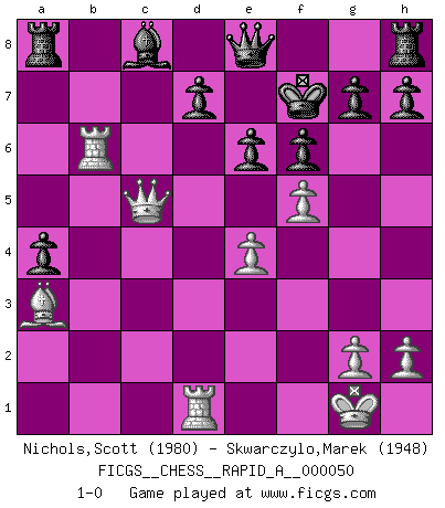 Last move : 1-0 2008 October 4 14:48:1 [Event "FICGS__CHESS__RAPID_A__000050"] [Site "FICGS"] [Date "2008.09.14"] [Round "1"] [White "Nichols,Scott"] [Black "Skwarczylo,Marek"] [Result "1-0"] [WhiteElo "1980"] [BlackElo "1948"] 1.e4 c5 2.d4 cxd4 3.c3 dxc3 4.Nxc3 Nc6 5.Nf3 e6 6.Bc4 a6 7.O-O b5 8.Bd3 Nge7 9.Re1 Ng6 10.Be3 Nce5 11.Nxe5 Nxe5 12.f4 Nxd3 13.Qxd3 Be7 14.a4 b4 15.a5 bxc3 16.Bb6 cxb2 17.Rab1 Bc5+ 18.Bxc5 Qxa5 19.Qd6 Qd8 20.Rxb2 a5 21.Rb6 a4 22.Ba3 f6 23.f5 Kf7 24.Rd1 Qe8 25.Qc5 1-0 Sicilian : Smith-Morra gambit Kingside Castling by player White (move 7) Player White won this chess game. Follow this game move after move (download)I love all positions. Give me a difficult positional game, I will play it. But totally won positions, I cannot stand them. (Hein Donner) Kasparov stellt für gewöhnlich die Regeln auf und bricht sie dann selbst wieder. (Alexej Shirov) Un Peón pasado aumenta su poder a medida de que el número de piezas en el tablero disminuye. (Capablanca) Botvinnik disait en comparant les échecs à la musique: Il existe une science dont le but est l'étude de l'acoustique et des sons. Mais il y a aussi un art qui se sert de l'océan des sons : c'est la musique. De toute évidence, il en est de même pour la pensée. La logique est l'étude des lois de la réflexion et les échecs reflètent, en tant qu'art, le côté logique de la réflexion, sous la forme d'images artistiques... Extrait de Fischer - Spassky, Reykjavik 1972 par Alexander & F. Wyndham (Ed. Solar), p 37. Some people are so afraid to die that they never begin to live. (Henry Van Dyke)