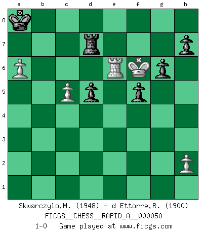 Last move : 1-0 2009 January 20 16:20:3 [Event "FICGS__CHESS__RAPID_A__000050"] [Site "FICGS"] [Date "2008.09.14"] [Round "1"] [White "Skwarczylo,Marek"] [Black "d Ettorre,Rodolfo"] [Result "1-0"] [WhiteElo "1948"] [BlackElo "1900"] 1.d4 e6 2.Nf3 Nf6 3.c4 b6 4.Nc3 Bb4 5.e3 Bb7 6.Bd3 Ne4 7.O-O Bxc3 8.bxc3 Nxc3 9.Qc2 Bxf3 10.gxf3 Qg5+ 11.Kh1 Qh5 12.Rg1 Qxf3+ 13.Rg2 f5 14.Ba3 Ne4 15.Rf1 Kf7 16.Be2 Qh3 17.d5 Na6 18.f3 Nf6 19.Rfg1 Rhg8 20.dxe6+ dxe6 21.Qa4 Nc5 22.Bxc5 bxc5 23.Qc6 Rac8 24.Qxc5 g6 25.Qxa7 Rgd8 26.a4 Qh4 27.a5 Nd7 28.Rg5 Qh6 29.f4 Qf8 30.e4 Qc5 31.Qxc5 Nxc5 32.exf5 exf5 33.Bf3 Rb8 34.Bd5+ Kf6 35.R5g3 Rd6 36.Ra3 Ra6 37.Rga1 c6 38.Bg2 Ne6 39.c5 Nxf4 40.Bf1 Ra7 41.a6 Nd5 42.Kg1 Rb4 43.Bg2 Rc4 44.Bxd5 cxd5 45.Ra5 Rg4+ 46.Kf2 Rb4 47.Rc1 Ke7 48.Re1+ Kd7 49.Re5 Kc6 50.Re6+ Kc7 51.Rf6 Ra8 52.Ra1 Rb2+ 53.Kg3 Rb3+ 54.Kf4 Rb4+ 55.Kg5 R4b8 56.Re1 Rd8 57.Re7+ Rd7 58.R7e6 Kb8 59.Rf8+ Ka7 60.Rxa8+ Kxa8 61.Kf6 1-0 Queen's pawn Kingside Castling by player White (move 7) Player White won this chess game. Follow this game move after move (download)Every Pawn is a potential Queen. (James Mason) Bogoljubow: Matt in vier Zügen! Tartakower: Ich verbitte mir jede Belästigung! (Savielly Grigorievitsch Tartakower) El Ajedrez es tortura mental. (Garry Kasparov) Je fais ceci parce que dans cinquante coups j'obtiendrai cela; je m'appelle Mikhail Moisevitch Botvinnik. (Botvinnik) Wawaweewa ! (Borat: Cultural learnings of America for make benefit glorious nation of Kazakhstan)