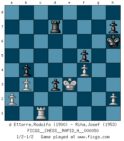 Last move : 1/2-1/2 2008 October 16 13:46:9 [Event "FICGS__CHESS__RAPID_A__000050"] [Site "FICGS"] [Date "2008.09.14"] [Round "1"] [White "d Ettorre,Rodolfo"] [Black "Riha,Josef"] [Result "1/2-1/2"] [WhiteElo "1900"] [BlackElo "1953"] 1.Nf3 Nf6 2.g3 g6 3.Bg2 Bg7 4.O-O O-O 5.d4 d6 6.c4 Nc6 7.Nc3 Rb8 8.d5 Na5 9.b3 a6 10.Qc2 c5 11.Nd2 b5 12.Bb2 e5 13.dxe6 fxe6 14.cxb5 axb5 15.Nce4 Nxe4 16.Nxe4 Bxb2 17.Qxb2 Bb7 18.Rad1 Bxe4 19.Bxe4 d5 20.Bg2 Qd7 21.Qc3 Nb7 22.Rd2 Rbc8 23.Bh3 Rc6 24.Rc1 Rd8 25.Qe5 b4 26.e3 Rf8 27.e4 d4 28.Rdc2 Qe7 29.f4 Rfc8 30.f5 Qg5 31.Qf4 Qxf4 32.gxf4 exf5 33.exf5 Rb6 34.Bg2 gxf5 35.Bxb7 Rxb7 36.Rxc5 Rxc5 37.Rxc5 Rd7 38.Kf2 d3 39.Rc1 Kg7 40.Ke3 Kh6 1/2-1/2 Reti : King's Indian attack Kingside Castling by player White (move 4) Kingside Castling by player Black (move 4) This chess game ended in a draw. Follow this game move after move (download)There just isn't enough televised Chess. (David Letterman) Der 70jährige Viktor Kortschnoi: Die Rentenanstalt wollte mich zwingen in Rente zu gehen. Meine Frau erhält jetzt eine Pension- und ich zahle weiter in die Rentenkasse ein! (Viktor Kortschnoi) Por tratar de evitar la pérdida de una pieza, muchas personas han perdido una partida de Ajedrez. (Savielly Tartakover) C'est une question de caractère, Beaucoup de gens perdent leur motivation très vite. D'autres, ils sont rares, peuvent la conserver très longtemps. J'aime les échecs, encore aujourd'hui je suis heureux d'analyser des parties. J'aime toujours gagner, je déteste encore perdre. Bien jouer est important pour mon intégrité intellectuelle et morale. Et puis les échecs vivent en ce moment une période historique grâce à Internet. Ils se développent dans les systèmes éducatifs à travers le monde. Ils sortent de leur ghetto, et c'est mon rôle de mener à bien cette révolution. (Gary Kasparov) Man with more than one clock never knows what time it is. (Chinese thought)