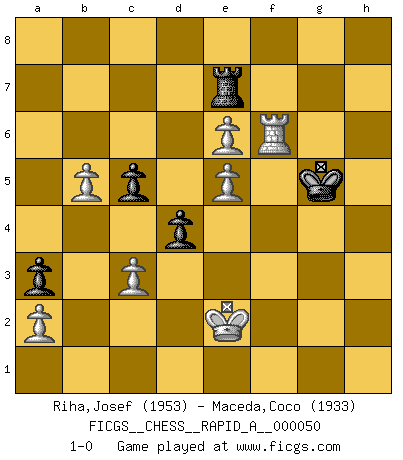 Last move : 1-0 2008 November 29 20:17:51 [Event "FICGS__CHESS__RAPID_A__000050"] [Site "FICGS"] [Date "2008.09.14"] [Round "1"] [White "Riha,Josef"] [Black "Maceda,Coco"] [Result "1-0"] [WhiteElo "1953"] [BlackElo "1933"] 1.e4 c6 2.d4 d5 3.e5 Bf5 4.Nf3 e6 5.Be2 Nd7 6.O-O Ne7 7.Nbd2 h6 8.Nb3 Bh7 9.c3 Nf5 10.Bd3 Be7 11.Qe2 O-O 12.g4 Nh4 13.Bxh7+ Kxh7 14.Nxh4 Bxh4 15.f4 f5 16.gxf5 Rxf5 17.Kh1 Be7 18.Rg1 a5 19.Be3 a4 20.Nd2 a3 21.b3 g6 22.Nf1 Bh4 23.Ng3 Rf7 24.Raf1 Qe7 25.f5 Rg8 26.Qg4 Bxg3 27.fxe6 Rxf1 28.Rxf1 Rf8 29.Rg1 h5 30.Bg5 hxg4 31.Bxe7 Rf2 32.Rxg3 Nf8 33.Bxf8 Rxf8 34.Rxg4 Kg7 35.h4 Re8 36.h5 Kh6 37.Rxg6+ Kxh5 38.Rf6 Kg5 39.Kg2 b6 40.Kf2 Re7 41.Ke2 c5 42.dxc5 bxc5 43.b4 d4 44.b5 1-0 Caro-Kann : Advance variation Kingside Castling by player White (move 6) Kingside Castling by player Black (move 11) Player White won this chess game. Follow this game move after move (download)Fischer is under obligation to nobody. (Joseph Platz) Ein Kibitz ist einer, der deinem Gegner gute Ratschläge gibt. (Andrew Soltis) El Ajedrez era la lengua materna de Capablanca. (Reti) Fischer est le meilleur joueur du monde et Karpov n'est qu'un joueur de bistrot. (Garry Kasparov, agé de 16 ans) In my experience, there's no such thing as luck. (Obi-Wan Kenobi in Star Wars ep.4)