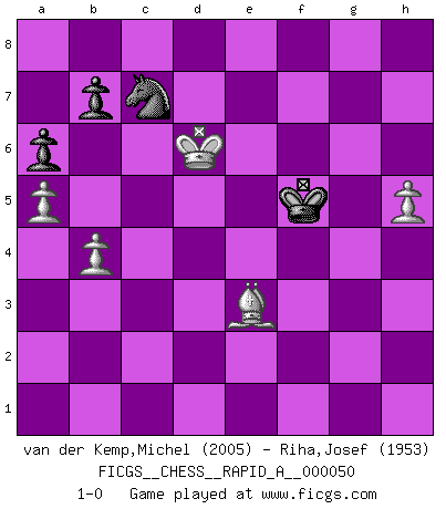 Last move : 1-0 2008 November 10 12:3:22 [Event "FICGS__CHESS__RAPID_A__000050"] [Site "FICGS"] [Date "2008.09.14"] [Round "1"] [White "van der Kemp,Michel"] [Black "Riha,Josef"] [Result "1-0"] [WhiteElo "2005"] [BlackElo "1953"] 1.e4 c5 2.Nf3 d6 3.d4 cxd4 4.Nxd4 Nf6 5.Nc3 a6 6.Be2 e5 7.Nb3 Be7 8.O-O O-O 9.Be3 Be6 10.Qd2 Nbd7 11.a4 Rc8 12.a5 Qc7 13.Rfc1 Qc6 14.Bf3 Bc4 15.Ra4 Rfe8 16.Rb4 Qc7 17.Ra4 Be6 18.h3 h6 19.Nd5 Nxd5 20.exd5 Bf5 21.Be2 Bg6 22.Bd3 Nf8 23.c4 f5 24.Qc2 Qd7 25.Rb4 Nh7 26.c5 dxc5 27.Nxc5 Bxc5 28.Bxc5 e4 29.Bf1 Bf7 30.Rd4 Re5 31.d6 f4 32.b4 Nf6 33.Re1 Rce8 34.Bb6 e3 35.fxe3 Rxe3 36.Rc1 f3 37.g4 Re1 38.Rxe1 Rxe1 39.Qf2 Qe6 40.Qxf3 Be8 41.Rd1 Bb5 42.Bc5 Bxf1 43.Rxe1 Qxe1 44.Qxf1 Qxf1+ 45.Kxf1 Kf7 46.Kg2 Ke6 47.Kf3 Ne8 48.Kf4 Nxd6 49.g5 Nf7 50.gxh6 gxh6 51.Bd4 Ng5 52.Kg4 Ne4 53.Kh5 Ng3+ 54.Kg6 h5 55.Kg5 h4 56.Bb6 Nf1 57.Bf2 Ng3 58.Kxh4 Ne4 59.Bb6 Kf5 60.Be3 Nf6 61.Kg3 Nd5 62.Bc5 Nf4 63.h4 Ne6 64.Kf3 Nc7 65.Ke3 Nb5 66.Be7 Ke5 67.h5 Nc7 68.Kd3 Nd5 69.Bg5 Kf5 70.Kc4 Nc7 71.Be3 Ne6 72.Kd5 Nc7+ 73.Kd6 1-0 Comment by player 1 : Michel van der Kemp : Thank you for the game. It sure was a difficult game to find the small road to victory. Sicilian : Najdorf, Opovcensky variation Kingside Castling by player White (move 8) Kingside Castling by player Black (move 8) 10 pieces endgame at move 50 : White KBPPP , Black KNPPP WHITE : King + 1 Bishop 3 Pawns BLACK : King + 1 Knight 3 Pawns 9 pieces endgame at move 58 : White KBPPP , Black KNPP WHITE : King + 1 Bishop 3 Pawns BLACK : King + 1 Knight 2 Pawns Player White won this chess game. Follow this game move after move (download)Chess is the art of analysis. (Mikhail Botvinnik) Das Schachspiel hat wie die Liebe, die Musik, die Fähigkeit, den Menschen glücklich zu machen. Ich habe ein leises Gefühl des Bedauerns für jeden, der das Schachspiel nicht kennt, so wie ich jeden bedaure, der die Liebe nicht kennt. (Siegbert Tarrasch) El Ajedrez es una manera fabulosa para que los niños aprendan a autovalorarse y a autoestimarse. (Saudin Robovic) Les échecs sont utiles à l'exercice de la faculté de penser et à celle de l'imagination. Car nous devons posséder une méthode élaborée pour atteindre des buts partout où nous devons conduire notre raison. (Leibnitz) Men never do evil so completely and cheerfully as when they do it from religious conviction. (Blaise Pascal)