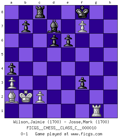 Last move : 0-1 2006 September 18 13:51:51 [Event "FICGS__CHESS__CLASS_C__000010"] [Site "FICGS"] [Date "2006.08.11"] [Round "1"] [White "Wilson,Jaimie"] [Black "Josse,Mark"] [Result "0-1"] [WhiteElo "1700"] [BlackElo "1700"] 1.e4 c5 2.Nf3 d6 3.d4 cxd4 4.Nxd4 Nf6 5.Nc3 g6 6.Be3 Bg7 7.f3 Nc6 8.Qd2 O-O 9.Bc4 Bd7 10.O-O-O Rc8 11.Bb3 Ne5 12.h4 h5 13.Bh6 Bxh6 14.Qxh6 Rxc3 15.bxc3 Qc8 16.Kb2 a5 17.a3 a4 18.Ba2 Qc5 19.g4 Qb6+ 20.Ka1 Qc5 21.Kb2 Rc8 22.Qd2 hxg4 23.h5 Nxf3 24.Nxf3 Nxe4 25.Qd4 Qxc3+ 26.Qxc3 Nxc3 27.hxg6 Nxd1+ 28.Rxd1 gxf3 29.gxf7+ Kf8 30.Rg1 e6 0-1 Sicilian : Dragon, Yugoslav attack Kingside Castling by player Black (move 8) Queenside Castling by player White (move 10) Player Black won this chess game. Follow this game move after move (download)We must make sure that Chess will not be like a dead language, very interesting, but for a very small group. (Sytze Faber) Frage: Gibt es etwas was Sie mehr lieben als Autobahnen ohne Tempobegrenzungen? - Antwort: Deutsche Frauen ohne Tempobegrenzungen. (Loek van Wely) Aunque la mayoría de la gente disfruta observar las partidas de los grandes Maestros de ataque, algunos de los jugadores mas notables en la historia han sido los jugadores silenciosos posicionales. Lentamente ellos te aplastan despojandote de tu espacio, congestionando tus piezas y dejandote virtualmente sin nada que hacer. (Yasser Seirawan) Les erreurs sont comme les malheurs, elles n'arrivent jamais seules. (Siegbert Tarrasch) Computer Science is no more about computers than astronomy is about telescopes. (Edsger W. Dijkstra)