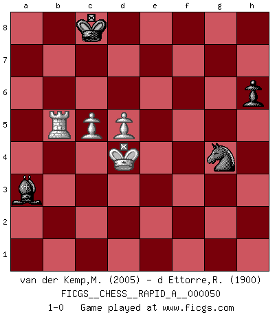 Last move : 1-0 2009 January 15 13:5:30 [Event "FICGS__CHESS__RAPID_A__000050"] [Site "FICGS"] [Date "2008.09.14"] [Round "1"] [White "van der Kemp,Michel"] [Black "d Ettorre,Rodolfo"] [Result "1-0"] [WhiteElo "2005"] [BlackElo "1900"] 1.e4 e5 2.f4 exf4 3.Nc3 Qh4+ 4.Ke2 d5 5.Nxd5 Bg4+ 6.Nf3 Nc6 7.Nxc7+ Kd8 8.Nxa8 Ne5 9.Qe1 Nxf3 10.Qxh4+ Nxh4 11.Ke1 Nf6 12.e5 Nh5 13.d4 Kc8 14.Kf2 Kb8 15.Bc4 f6 16.exf6 gxf6 17.Re1 Bd6 18.Bf7 Kxa8 19.h3 f3 20.Bxh5 Bxh5 21.Re6 Rc8 22.c3 Bc7 23.g4 Bg6 24.Bd2 Bd8 25.Rd6 b5 26.a4 bxa4 27.Rxa4 Be8 28.Ra1 f5 29.Rh6 Rc7 30.Re1 Bc6 31.Bf4 Rc8 32.Rxc6 Rxc6 33.Re8 Rc8 34.Bg5 fxg4 35.hxg4 Bxg5 36.Rxc8+ Kb7 37.Rf8 h6 38.c4 a5 39.c5 a4 40.Re8 Kc7 41.Re6 Bc1 42.Rb6 Kd8 43.d5 a3 44.bxa3 Bxa3 45.Rb5 Kc8 46.Kg3 Ng6 47.Kxf3 Ne5+ 48.Ke4 Nxg4 49.Kd4 1-0 KGA : Keres (Mason-Steinitz) gambit 10 pieces endgame at move 44 : White KRPPP , Black KBNPP WHITE : King + 1 Rook 3 Pawns BLACK : King + 1 Bishop 1 Knight 2 Pawns 9 pieces endgame at move 47 : White KRPPP , Black KBNP WHITE : King + 1 Rook 3 Pawns BLACK : King + 1 Bishop 1 Knight 1 Pawn 8 pieces endgame at move 48 : White KRPP , Black KBNP WHITE : King + 1 Rook 2 Pawns BLACK : King + 1 Bishop 1 Knight 1 Pawn Player White won this chess game. Follow this game move after move (download)The mistakes are there, waiting to be made. (Savielly Tartakower) Ein Buch ist ein Spiegel; wenn ein Affe hineinsieht, so kann kein Apostel heraus gucken. (Georg Christoph Lichtenberg) La esencia del Ajedrez es pensar acerca de lo que el Ajedrez es. (David Bronstein) Toutes les manuvres exécutées sur une colonne ouverte ont pour but ultime l'intrusion définitive sur la septième ou la huitième rangée, en plein cur de la position ennemie. (Aaron Nimzovitch) The greatest con, that he ever pulled... was making you believe... that he is you. (Revolver, movie)