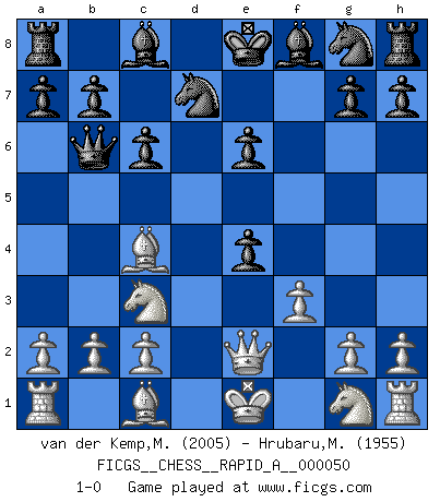 Last move : 1-0 2008 November 20 9:35:28 [Event "FICGS__CHESS__RAPID_A__000050"] [Site "FICGS"] [Date "2008.09.14"] [Round "1"] [White "van der Kemp,Michel"] [Black "Hrubaru,Mircea"] [Result "1-0"] [WhiteElo "2005"] [BlackElo "1955"] 1.e4 c6 2.d4 d5 3.f3 Qb6 4.Nc3 dxe4 5.Bc4 e5 6.dxe5 Nd7 7.e6 fxe6 8.Qe2 1-0 This chess game has been lost on time (started : 2008.09.14 3:50:50) Caro-Kann : Tartakower (fantasy) variation Player White won this chess game. Follow this game move after move (download)The Pawns are the soul of the game. (Francois Andre Danican Philidor) Sicherlich können nur Meister einen Stil haben. Daß ein nicht-Meister auch nur ein einziges Mal in seinem Leben eine Partie folgerecht durchführte, habe ich niemals bemerkt. (Emanuel Lasker) El Rey es una pieza de pelea. ¡Usenlo!. (Wilhelm Steinitz) Un footballeur joue avec ses pieds, parfois avec sa tête. Un joueur d'échecs ne joue qu'avec sa tête. Et quand il ne joue plus, il meurt. (Jacob Murray) I don't know, I don't care, and it doesn't make any difference. (Albert Einstein)