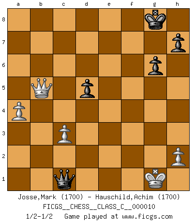 Last move : 1/2-1/2 2006 September 8 9:5:6 [Event "FICGS__CHESS__CLASS_C__000010"] [Site "FICGS"] [Date "2006.08.11"] [Round "1"] [White "Josse,Mark"] [Black "Hauschild,Achim"] [Result "1/2-1/2"] [WhiteElo "1700"] [BlackElo "1700"] 1.e4 c5 2.Nc3 d6 3.f4 g6 4.Nf3 Bg7 5.Bb5+ Bd7 6.Bc4 Nc6 7.O-O Nh6 8.d3 Na5 9.Bb5 O-O 10.Bxd7 Qxd7 11.a3 f5 12.Qe1 Nc6 13.Nd1 Nd4 14.Nxd4 cxd4 15.Bd2 Rac8 16.Rc1 Rc6 17.Qh4 e6 18.c3 Ng4 19.Qg3 dxc3 20.Bxc3 e5 21.exf5 Qxf5 22.Ne3 Nxe3 23.Qxe3 exf4 24.Qxa7 Bxc3 25.Rxc3 Rxc3 26.bxc3 Qxd3 27.Qxb7 d5 28.a4 Qe3+ 29.Kh1 Qe4 30.Qb5 f3 31.gxf3 Rxf3 32.Rxf3 Qxf3+ 33.Kg1 Qe3+ 34.Kg2 Qe4+ 35.Kg3 Qe1+ 36.Kg2 Qd2+ 37.Kg1 Qc1+ 1/2-1/2 Sicilian : Closed Kingside Castling by player White (move 7) Kingside Castling by player Black (move 9) 10 pieces endgame at move 32 : White KQPPP , Black KQPPP WHITE : King + 1 Queen 3 Pawns BLACK : King + 1 Queen 3 Pawns This chess game ended in a draw. Follow this game move after move (download)Life is like a game of Chess, changing with each move. (Chinese proverb) Ich liebe den Moment, wenn ich das Ego meines Gegenüber breche. (Robert James Fischer) Si no le temes a Spassky, entonces elimino el elemento del dinero. (Jim Slater) Echiquier : carré parfait, comme la Jérusalem nouvelle décrite par l'auteur de l'Apocalypse, huit cases sur huit, exaltation du chiffre 4, symbole du cosmos aux quatre horizons... où le noir et le blanc, l'ombre et la lumière, le mal et le bien s'entremêlent et se conjuguent. (Robert Couffignal, Le Gambit du poète) History is the quarrels of popes and kings, with wars or pestilences in every page; the men all so good for nothing, and hardly any women at all. (Jane Austen)