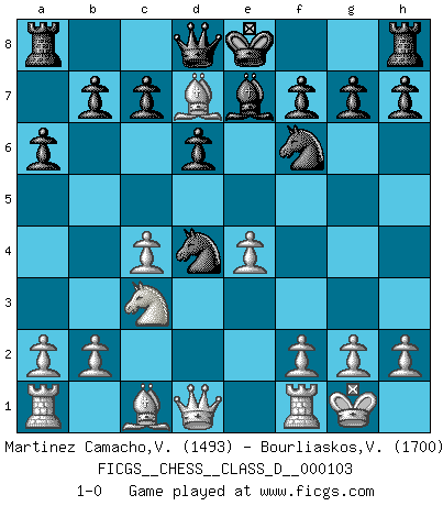 Last move : 1-0 2008 November 9 2:15:12 [Event "FICGS__CHESS__CLASS_D__000103"] [Site "FICGS"] [Date "2008.09.14"] [Round "1"] [White "Martinez Camacho,Victor Hugo"] [Black "Bourliaskos,Vassilis"] [Result "1-0"] [WhiteElo "1493"] [BlackElo "1700"] 1.e4 e5 2.Nf3 Nc6 3.Bb5 a6 4.Ba4 d6 5.c4 Bd7 6.O-O Nf6 7.Nc3 Be7 8.d4 exd4 9.Nxd4 Nxd4 10.Bxd7+ 1-0 This chess game has been lost on time (started : 2008.09.14 11:54:6) Ruy Lopez : Modern Steinitz defense, Duras (Keres) variation Kingside Castling by player White (move 6) Player White won this chess game. Follow this game move after move (download)A Chess game is a dialogue, a conversation between a player and his opponent. Each move by the opponent may contain threats or be a blunder, but a player cannot defend against threats or take advantage of blunders if he does not first ask himself: What is my opponent planning after each move ? (Bruce A. Moon) Aljechin war kein Nazi. Er war ein Opportunist. Ein schrecklicher Mann. Er liebte Geld über alles und würde für Geld ein Jude, ein Katolik oder ein Protestant werden. (Miguel Najdorf) Si tu oponente no puede hacer nada activo, entonces no apures la posición; En vez de eso, dejalo estar sentado ahí, sufriendo y rogandote por un empate. (Jeremy Silman) Comme les marins qui ont mille raisons différentes d'aller en mer, les joueurs d'échecs en ont tout autant avant de s'installer devant une table et jouer... (Vincent Bertignac, philosophe) He who fights with monsters should be careful lest he thereby become a monster. (Friedrich Nietzsche, Beyond Good and Evil)