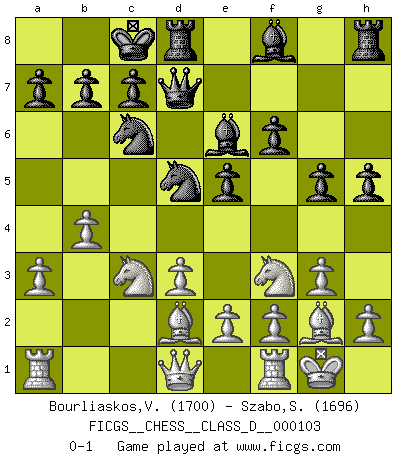 Last move : 0-1 2009 January 14 6:49:52 [Event "FICGS__CHESS__CLASS_D__000103"] [Site "FICGS"] [Date "2008.09.14"] [Round "1"] [White "Bourliaskos,Vassilis"] [Black "Szabo,Sandor"] [Result "0-1"] [WhiteElo "1700"] [BlackElo "1696"] 1.c4 e5 2.Nc3 Nc6 3.d3 Nf6 4.g3 d5 5.cxd5 Nxd5 6.Bg2 Be6 7.Bd2 Qd7 8.Nf3 f6 9.O-O O-O-O 10.a3 g5 11.b4 h5 0-1 This chess game has been lost on time (started : 2008.09.14 11:54:6) English : Sicilian Reversed Kingside Castling by player White (move 9) Queenside Castling by player Black (move 9) Player Black won this chess game. Follow this game move after move (download)Chess is like war on a board. (Bobby Fischer) Das Schachspiel ist ein See, in welchem eine Mücke baden und ein Elefant ertrinken kann. (Emanuel Lasker) El juego del Ajedrez no es solamente una diversión quieta; algunas cualidades muy valuables de la mente se pueden adquirir y cultivar con el, como convertirlos en habitos disponibles para toda ocasión; ya que la vida es algo así como el Ajedrez. (Benjamin Franklin) C'est une question de caractère, Beaucoup de gens perdent leur motivation très vite. D'autres, ils sont rares, peuvent la conserver très longtemps. J'aime les échecs, encore aujourd'hui je suis heureux d'analyser des parties. J'aime toujours gagner, je déteste encore perdre. Bien jouer est important pour mon intégrité intellectuelle et morale. Et puis les échecs vivent en ce moment une période historique grâce à Internet. Ils se développent dans les systèmes éducatifs à travers le monde. Ils sortent de leur ghetto, et c'est mon rôle de mener à bien cette révolution. (Gary Kasparov) The human is the only animal species whose members are able to talk themselves into difficulties that would not otherwise exist. (Wendell Johnson)