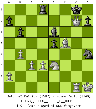 Last move : 1-0 2009 August 22 18:47:19 [Event "FICGS__CHESS__CLASS_D__000103"] [Site "FICGS"] [Date "2008.09.14"] [Round "1"] [White "Satonnet,Patrick"] [Black "Ruano,Pablo"] [Result "1-0"] [WhiteElo "1587"] [BlackElo "1740"] 1.e4 c5 2.f4 d5 3.Nc3 d4 4.Nce2 Nf6 5.d3 Nc6 6.Nf3 g6 7.Ng3 Ng4 8.Be2 Bg7 9.O-O O-O 10.Ne1 Ne3 11.Bxe3 dxe3 12.c3 Qb6 13.Qc1 Bd7 14.Nc2 e5 15.Nxe3 Qd8 16.f5 Bh6 17.Bg4 Nd4 18.Rf2 gxf5 19.exf5 Qg5 20.Ngf1 Nc6 21.Qc2 Rad8 22.Bf3 b6 23.Be4 Ne7 24.f6 Ng6 25.g3 Kh8 26.Kh1 Rg8 27.Nf5 Bf8 28.N1e3 c4 29.Nxc4 Be6 30.h4 Qxf6 31.Nh6 Qg7 32.Nxg8 Kxg8 33.b4 Ne7 34.Ne3 Qxg3 35.Rg2 Qg7 36.Rxg7+ Bxg7 37.Rg1 f5 38.Qg2 Ng6 39.Bxf5 Nxh4 40.Qxg7+ 1-0 Sicilian : Grand Prix attack Kingside Castling by player White (move 9) Kingside Castling by player Black (move 9) Player White won this chess game. Follow this game move after move (download)Chess demands total concentration. (Bobby Fischer) In der Schule lernt man nichts. Es ist nur Zeitverschwendung. (Robert James Fischer) El Ajedrez es una hermosa aventura. (Bent Larsen) Les échecs sont utiles à l'exercice de la faculté de penser et à celle de l'imagination. Car nous devons posséder une méthode élaborée pour atteindre des buts partout où nous devons conduire notre raison. (Leibnitz) The ego is not master in its own house. (Sigmund Freud)