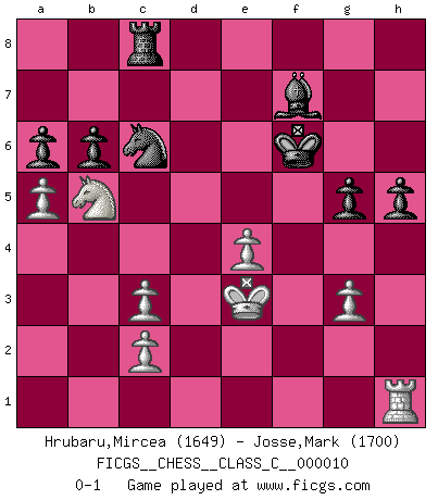 Last move : 0-1 2006 September 23 16:57:39 [Event "FICGS__CHESS__CLASS_C__000010"] [Site "FICGS"] [Date "2006.08.11"] [Round "1"] [White "Hrubaru,Mircea"] [Black "Josse,Mark"] [Result "0-1"] [WhiteElo "1649"] [BlackElo "1700"] 1.e4 c5 2.Nf3 d6 3.d4 cxd4 4.Nxd4 Nf6 5.Nc3 g6 6.f4 Nc6 7.Nb3 Bg7 8.Be3 Ng4 9.Bg1 e5 10.Be2 exf4 11.Bxg4 Qh4+ 12.Bf2 Qxg4 13.O-O Bxc3 14.bxc3 Qxd1 15.Raxd1 Ke7 16.Nd4 Ne5 17.Nb5 Be6 18.Nxd6 b6 19.a4 Rhd8 20.Nb5 Bc4 21.Rfe1 Rxd1 22.Rxd1 f6 23.Bd4 g5 24.Kf2 h5 25.Rh1 Nc6 26.g3 fxg3+ 27.hxg3 Bf7 28.Ke3 Rc8 29.a5 a6 30.Bxf6+ Kxf6 0-1 Sicilian : Dragon, Levenfish variation Kingside Castling by player White (move 13) Player Black won this chess game. Follow this game move after move (download)Avoid the crowd. Do your own thinking independently. Be the Chess player, not the Chess piece. (Ralph Charell) Im Wettkampf zwischen starken Meistern kommen Fehler sehr selten vor, deshalb ist es mit bloßem Warten nicht getan. (José Raúl Capablanca) No volvere nunca a jugar contigo. Has insultado a mi amigo. - cuando un oponente se maldijo por una mala jugada (Miguel Najdorf) Demandez au pauvre Cg1 ce qu'il en pense. Eduard Gufeld à propos de la variante Saemisch de l'Est-Indienne. I don't believe in psychology. I believe in good moves. (Bobby Fischer)
