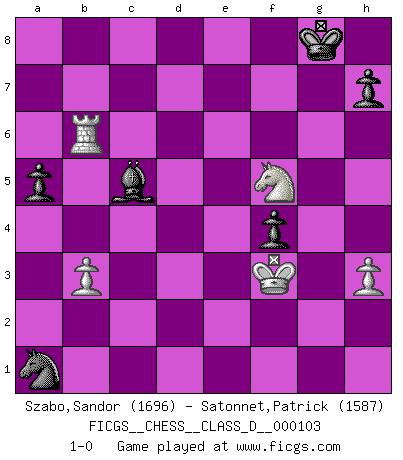 Last move : 1-0 2009 October 18 21:30:54 [Event "FICGS__CHESS__CLASS_D__000103"] [Site "FICGS"] [Date "2008.09.14"] [Round "1"] [White "Szabo,Sandor"] [Black "Satonnet,Patrick"] [Result "1-0"] [WhiteElo "1696"] [BlackElo "1587"] 1.d4 Nf6 2.c4 e6 3.Nf3 Bb4+ 4.Nc3 O-O 5.e3 b6 6.Bd3 Bb7 7.O-O c5 8.Bd2 cxd4 9.exd4 d5 10.cxd5 Nxd5 11.Rc1 Nf6 12.Bg5 Nc6 13.Be4 Be7 14.Bxf6 Bxf6 15.Re1 Rc8 16.d5 exd5 17.Nxd5 Re8 18.Rc2 g6 19.Rd2 Bg7 20.g3 Ba8 21.Nb4 Qf6 22.Rd7 Nxb4 23.Bxa8 Rxe1+ 24.Qxe1 Rxa8 25.Qe4 Qc6 26.Qxc6 Nxc6 27.b3 Re8 28.Rc7 Nd4 29.Ng5 f6 30.Nh3 a5 31.Rd7 f5 32.Kf1 Rc8 33.Kg2 Nc2 34.Ng5 Nb4 35.a3 Nc2 36.Rb7 Rc6 37.Rb8+ Bf8 38.Nf3 Nxa3 39.Ne5 Rd6 40.Kh3 g5 41.Kg2 Nc2 42.h3 Na1 43.Nc4 Rd4 44.Ne3 f4 45.gxf4 gxf4 46.Nf5 Rd2 47.Rxb6 Rxf2+ 48.Kxf2 Bc5+ 49.Kf3 1-0 This chess game has been lost on time (started : 2008.09.14 11:54:6) Bogo-Indian defense Kingside Castling by player Black (move 4) Kingside Castling by player White (move 7) Player White won this chess game. Follow this game move after move (download)Chess problems demand from the composer the same virtues that characterize all worthwhile art: originality, invention, conciseness, harmony, complexity, and splendid insincerity. (Vladimir Nabokov) Zum Sieg gelangt man nicht, wenn man gut, sondern nur wenn man besser spielt (Savielly Grigorievitsch Tartakower) Aquel que ve no otra dirección en el juego que la de dar Jaque Mate a su oponente, nunca será un buen jugador de Ajedrez. (Euwe) Le thème de l'attaque double intervient d'une manière ou d'une autre dans l'immense majorité des combinaisons. (Youri Averbakh) Imagination is more important than knowledge. Knowledge is limited. Imagination encircles the world. (Albert Einstein)