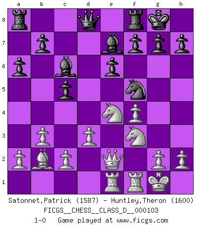 Last move : 1-0 2008 December 25 3:40:36 [Event "FICGS__CHESS__CLASS_D__000103"] [Site "FICGS"] [Date "2008.09.14"] [Round "1"] [White "Satonnet,Patrick"] [Black "Huntley,Theron"] [Result "1-0"] [WhiteElo "1587"] [BlackElo "1600"] 1.e4 c5 2.f4 d5 3.Nc3 dxe4 4.Nxe4 e6 5.Nf3 Nc6 6.Bb5 Bd7 7.Qe2 Nh6 8.O-O a6 9.Bxc6 Bxc6 10.b3 Nf5 11.Bb2 Be7 12.d3 O-O 13.Rae1 1-0 Sicilian : Grand Prix attack Kingside Castling by player White (move 8) Kingside Castling by player Black (move 12) Player White won this chess game. Follow this game move after move (download)It began to feel as though you were playing against Chess itself. - On playing against Robert Fischer. (Walter Shipman) Nach Morphy wurde nichts neues mehr in der Behandlung offener Positionen gefunden. (Mikhail Moiseyevich Botvinik) No hay precio que sea tan grande por la cabellera del Rey enemigo. (Koblentz) La solitude du joueur d'Echecs à l'approche du mat est semblable à celle du condamné. (Francis Szpiner) Who needs drugs and alcohol if he can play Big Chess at FICGS ? (Heinz-Georg Lehnhoff)