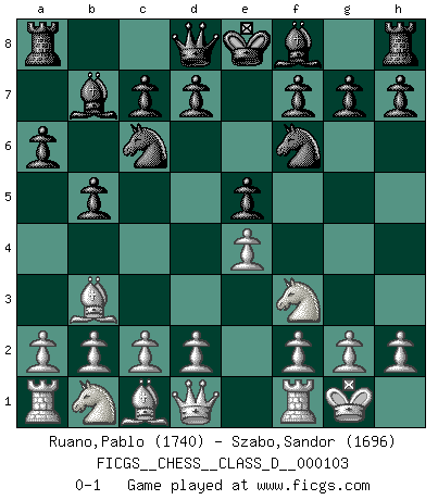 Last move : 0-1 2008 November 30 10:33:14 [Event "FICGS__CHESS__CLASS_D__000103"] [Site "FICGS"] [Date "2008.09.14"] [Round "1"] [White "Ruano,Pablo"] [Black "Szabo,Sandor"] [Result "0-1"] [WhiteElo "1740"] [BlackElo "1696"] 1.e4 e5 2.Nf3 Nc6 3.Bb5 a6 4.Ba4 Nf6 5.O-O b5 6.Bb3 Bb7 0-1 This chess game has been lost on time (started : 2008.09.14 11:54:6) Ruy Lopez : Archangelsk (counterthrust) variation Kingside Castling by player White (move 5) Player Black won this chess game. Follow this game move after move (download)Fischer is completely natural. He plays no roles. He's like a child. Very, very simple. (Zita Rajcsanyi) Ich kenne Menschen, die allen Willen der Welt besitzen und doch nicht Schach spielen können. (Robert James Fischer) Robert Fischer es la ley hacia si mismo. (Larry Evans) Les échecs, c'est la lutte contre l'erreur. (Johannes Zukertort) Thibault, I ask for draw. Game 13876. - Sorry Ilmars, you won. (FICGS chat)
