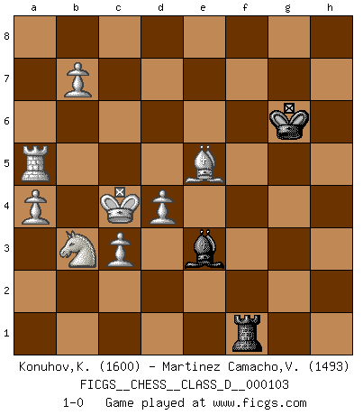 Last move : 1-0 2008 December 29 2:59:57 [Event "FICGS__CHESS__CLASS_D__000103"] [Site "FICGS"] [Date "2008.09.14"] [Round "1"] [White "Konuhov,Konstantin"] [Black "Martinez Camacho,Victor Hugo"] [Result "1-0"] [WhiteElo "1600"] [BlackElo "1493"] 1.e4 c6 2.Nf3 d5 3.exd5 cxd5 4.d4 Bg4 5.h3 Bh5 6.Be3 e6 7.Bb5+ Nc6 8.O-O Bd6 9.c3 Nge7 10.g4 Bg6 11.Nbd2 Qb6 12.Qb3 a6 13.Be2 Qxb3 14.Nxb3 O-O 15.Rfe1 h6 16.Nc5 b6 17.Nd7 Rfd8 18.Nxb6 Rab8 19.Na4 a5 20.b3 f5 21.Bd1 fxg4 22.hxg4 Bh7 23.g5 Nf5 24.Bd2 hxg5 25.Rxe6 g4 26.Ng5 g3 27.Nxh7 Kxh7 28.Bc2 g6 29.fxg3 Nce7 30.Rae1 Bxg3 31.Rxe7+ Nxe7 32.Rxe7+ Kh8 33.Bxg6 Rf8 34.Bf7 Bd6 35.Rd7 Bg3 36.Bxd5 Rbe8 37.Bh6 Bf2+ 38.Kg2 Rf5 39.Bc4 Be1 40.Bg7+ Kh7 41.Bd3 Kg6 42.Bxf5+ Kxf5 43.Kf3 Bd2 44.Rd5+ Kg6 45.Be5 Rf8+ 46.Ke4 Rf1 47.Rxa5 Re1+ 48.Kd3 Bg5 49.Kc4 Ra1 50.Nc5 Bd2 51.a4 Rc1 52.Ne4 Be3 53.b4 Bg1 54.b5 Rb1 55.Nd2 Rd1 56.Nb3 Be3 57.b6 Rf1 58.b7 1-0 Caro-Kann defense Kingside Castling by player White (move 8) Kingside Castling by player Black (move 14) Player White won this chess game. Follow this game move after move (download)Modern Chess is too much concerned with things like Pawn structure. Forget it, Checkmate ends the game. (Nigel Short) Ein Kibitz ist einer, der deinem Gegner gute Ratschläge gibt. (Andrew Soltis) Alekhine es un poeta que crea un trabajo de arte de algo que raramente inspiraría a otra persona a mandar una tarjeta postal. (Max Euwe) Ce qui caractérise les parties de combat, c'est que si le défenseur a constamment de difficiles problèmes à résoudre, l'attaquant doit chercher sans relâche de nouvelles possibilités d'attaque. (Koblentz) I've lost money so fast in these clubs it's left me reeling. I've read every poker book ever written, but the only way to get better at the game is to go out and play with people who are really good. The problem is, you stand to lose a lot of money doing it. (Matt Damon)