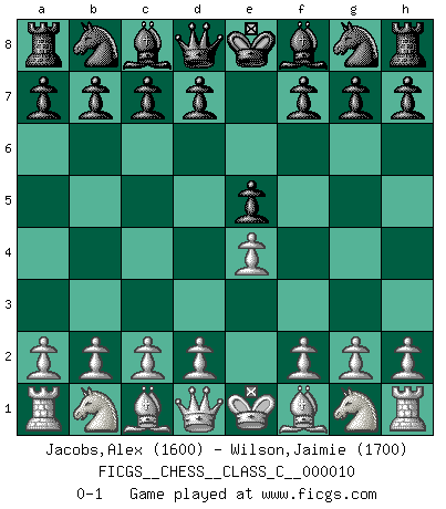 Last move : 0-1 2006 September 20 20:6:4 [Event "FICGS__CHESS__CLASS_C__000010"] [Site "FICGS"] [Date "2006.08.11"] [Round "1"] [White "Jacobs,Alex"] [Black "Wilson,Jaimie"] [Result "0-1"] [WhiteElo "1600"] [BlackElo "1700"] 1.e4 e5 0-1 This chess game has been lost on time (started : 2006.08.11 7:19:5) King's pawn game Player Black won this chess game. Follow this game move after move (download)Bobby Fischer's current state of mind is indeed a tragedy. One of the world's greatest Chess players - the pride and sorrow of American Chess. (Frank Brady) Fischer machte Schach einfach zu einer aufregenden Sache, wann immer er sich ans Brett setzte. (Raymond Keene) Cuando la partida de Ajedrez termina, el Peón y el Rey regresan a la misma caja. (Irish saying) Il a essayé de se convaincre qu'il pourrait empêcher toutes les erreurs et ne jamais perdre. L'horreur ! Gary Kasparov au sujet de Robert Fischer. The only thing that matters is the evidence. (Horatio Caine, C.S.I. Miami)