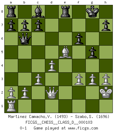 Last move : 0-1 2008 December 8 17:22:44 [Event "FICGS__CHESS__CLASS_D__000103"] [Site "FICGS"] [Date "2008.09.14"] [Round "1"] [White "Martinez Camacho,Victor Hugo"] [Black "Szabo,Sandor"] [Result "0-1"] [WhiteElo "1493"] [BlackElo "1696"] 1.e4 e5 2.Nf3 Nf6 3.Nxe5 d6 4.Nf3 Nxe4 5.d4 d5 6.Bd3 Be7 7.O-O Nc6 8.c3 O-O 9.h3 Qd6 10.Nbd2 Qg6 11.Nxe4 dxe4 12.Ne5 Nxe5 13.Bxe4 Qxe4 14.Re1 Nf3+ 15.gxf3 Qg6+ 16.Kh2 Qf6 17.Rg1 Bd6+ 18.Rg3 Bxg3+ 19.fxg3 Re8 20.Bf4 g5 21.Be5 Qb6 22.Qd2 f6 0-1 Petrov : Classical attack Kingside Castling by player White (move 7) Kingside Castling by player Black (move 8) Player Black won this chess game. Follow this game move after move (download)My style is somewhere between that of Tal and Petrosian. (Reshevsky) Der Knackpunkt bei der Konzentration ist, daß wir nur durch sie etwas Neues und Ungewöhnliches am Schachbrett finden können. Sie ist der einzige Weg durch neue neue Ideen eine Überraschung zu bereiten. (Garry Kasparov) Una victoria por una combinación errónea, aunque sea espectacular, me llena de horror artístico. (Wilhelm Steinitz) Botvinnik disait en comparant les échecs à la musique: Il existe une science dont le but est l'étude de l'acoustique et des sons. Mais il y a aussi un art qui se sert de l'océan des sons : c'est la musique. De toute évidence, il en est de même pour la pensée. La logique est l'étude des lois de la réflexion et les échecs reflètent, en tant qu'art, le côté logique de la réflexion, sous la forme d'images artistiques... Extrait de Fischer - Spassky, Reykjavik 1972 par Alexander & F. Wyndham (Ed. Solar), p 37. Sometimes it pays to stay in bed in Monday, rather than spending the rest of the week debugging Monday's code. (Dan Salomon)