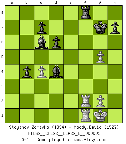 Last move : 0-1 2008 September 25 9:16:28 [Event "FICGS__CHESS__CLASS_E__000092"] [Site "FICGS"] [Date "2008.09.14"] [Round "1"] [White "Stoyanov,Zdravko"] [Black "Moody,David"] [Result "0-1"] [WhiteElo "1334"] [BlackElo "1527"] 1.e4 e5 2.Nf3 Nc6 3.Bb5 a6 4.Bxc6 bxc6 5.a3 d6 6.h3 g6 7.c3 c5 8.O-O Bg7 9.d3 Ne7 10.Qb3 Be6 11.Qd1 O-O 12.Bg5 Qd7 13.Bxe7 Qxe7 14.Nbd2 f5 15.exf5 gxf5 16.c4 Bd7 17.Re1 Bc6 18.Rb1 Qf7 19.Ng5 Qg6 20.Ngf3 e4 21.dxe4 fxe4 22.Nh4 Qf6 23.Nxe4 Qxh4 24.Ng3 Bd4 25.Rf1 Qxg3 26.Qg4+ Qxg4 27.hxg4 Rxf2 28.Rxf2 Rf8 29.Rbf1 a5 30.g5 Kg7 31.b4 cxb4 32.axb4 axb4 0-1 Ruy Lopez : Exchange variation Kingside Castling by player White (move 8) Kingside Castling by player Black (move 11) Player Black won this chess game. Follow this game move after move (download)Combinations have always been the most intriguing aspect of Chess. The masters look for them, the public applauds them, the critics praise them. It is because combinations are possible that Chess is more than a lifeless mathematical exercise. They are the poetry of the game; they are to Chess what melody is to music. They represent the triumph of mind over matter. (Reuben Fine) Was ist der Unterschied zwischen einem Strassenarbeiter und einem Schachspieler? --Der Schachspieler bewegt sich ab und zu. (Anonymous) La belleza de un movimiento no se refleja solo en su apariencia, sino en el pensamiento detrás de él. (Siegbert Tarrasch) Soyez une menace à chaque fois que vous vous asseyez pour jouer. (Ken Smith) Memory is a crazy woman that hoards colored rags and throws away food. (Austin O'Malley)