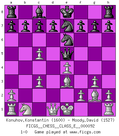 Last move : 1-0 2008 October 16 18:6:41 [Event "FICGS__CHESS__CLASS_E__000092"] [Site "FICGS"] [Date "2008.09.14"] [Round "1"] [White "Konuhov,Konstantin"] [Black "Moody,David"] [Result "1-0"] [WhiteElo "1600"] [BlackElo "1527"] 1.e4 e5 2.Nf3 Nc6 3.d4 exd4 4.Nxd4 Qf6 5.Be3 Bc5 6.c3 Nge7 7.b4 Nxd4 8.bxc5 Ne6 9.g3 Qe5 10.Bg2 1-0 Scotch game Player White won this chess game. Follow this game move after move (download)Dazzling combinations are for the many, shifting wood is for the few. (Georg Kieninger) Das Schach hält seine Meister in eigenen Banden, Fesseln; auf vielerlei Weise formt es ihren Geist, so dass die innere Freiheit selbst des Stärksten beeinflusst wird. (Albert Einstein) Si pudieramos observar el interior de la cabeza de un jugador de Ajedrez, encontraríamos ahí un mundo lleno de sentimientos, imágenes, ideas, emoción y pasión. (Alfred Binet) Il n'y a pas eu de défaite parce que je ne crois pas que cet ordinateur ait jamais existé. IBM a triché en refusant d'imprimer les modes de recherche de la machine. C'est évident, pendant le match, des coups décisifs ont été joués par des êtres humains. Aujourd'hui, les meilleurs spécialistes en informatique ne peuvent toujours pas expliquer comment Deep-Blue a pu jouer contre la logique des ordinateurs. IBM a gagné une guerre de communication, mais ils sont incapables de prouver que l'ordinateur a gagné tout seul. (Garry Kasparov) It is the aim of the modern school, not to treat every position according to one general law, but according to the principle inherent in the position. (Richard Reti)