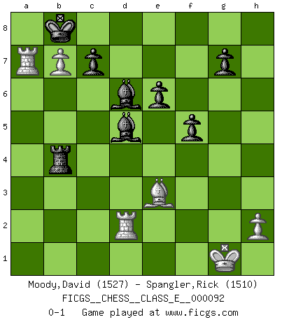 Last move : 0-1 2008 October 14 18:27:24 [Event "FICGS__CHESS__CLASS_E__000092"] [Site "FICGS"] [Date "2008.09.14"] [Round "1"] [White "Moody,David"] [Black "Spangler,Rick"] [Result "0-1"] [WhiteElo "1527"] [BlackElo "1510"] 1.e4 Nf6 2.e5 Nd5 3.c4 Nb6 4.d4 d6 5.f4 dxe5 6.fxe5 Nc6 7.Be3 h5 8.Nc3 Bg4 9.Nf3 e6 10.Be2 Qd7 11.O-O O-O-O 12.c5 Nd5 13.Nxd5 Qxd5 14.b4 Qe4 15.Qb3 Nxd4 16.Nxd4 Bxe2 17.Rf4 Qxe5 18.Re1 Bg4 19.Qa4 a6 20.c6 Rxd4 21.Rxd4 Bd6 22.cxb7+ Kxb7 23.g3 Qb5 24.Qb3 Bf3 25.a4 Bd5 26.axb5 Bxb3 27.bxa6+ Kxa6 28.Ra1+ Kb7 29.Rd3 Bd5 30.b5 f5 31.Ra7+ Kb8 32.b6 h4 33.b7 Rh5 34.gxh4 Rxh4 35.Rd2 Rb4 0-1 Alekhine's defense Kingside Castling by player White (move 11) Queenside Castling by player Black (move 11) Player Black won this chess game. Follow this game move after move (download)Could we look into the head of a Chess player, we should see there a whole world of feelings, images, ideas, emotion and passion. (Alfred Binet) Ich hatte Zahnschmerzen im ersten Spiel. In der zweiten Partie tat mir der Kopf weh. In der dritten war es eine Rheuma-Attacke und während der vierten fühlte ich mich nicht gut. Und in der fünften? Nun, man muss doch nicht jedes Spiel gewinnen, oder? (Savielly Grigorievitsch Tartakower) El Ajedrez es un cuento de Hadas de las 1001 metidas de pata. (Savielly Tartakower) Mon pion favori sur ma case favorite ! Bronstein en parlant d'un coup de pion en h5 quand il avait les Noirs. Information on the Internet is subject to the same rules and regulations as conversation at a bar. (George Lundberg)