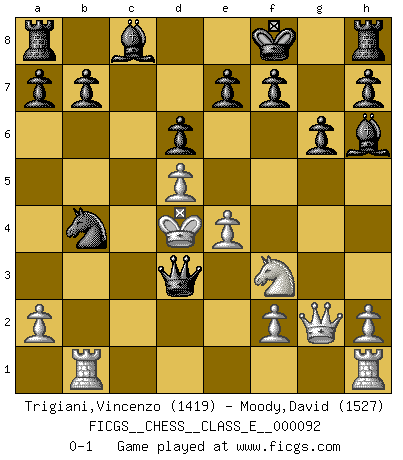Last move : 0-1 2008 September 24 9:34:2 [Event "FICGS__CHESS__CLASS_E__000092"] [Site "FICGS"] [Date "2008.09.14"] [Round "1"] [White "Trigiani,Vincenzo"] [Black "Moody,David"] [Result "0-1"] [WhiteElo "1419"] [BlackElo "1527"] 1.d4 Nf6 2.Nc3 g6 3.Bf4 Bg7 4.Nb5 d6 5.Nf3 Nd5 6.e4 Nxf4 7.Bc4 Nxg2+ 8.Kd2 c6 9.Qg1 cxb5 10.Bxb5+ Kf8 11.Rf1 Qa5+ 12.Kc1 Qxb5 13.Qxg2 Nc6 14.d5 Qxb2+ 15.Kd2 Nb4 16.Rb1 Qxc2+ 17.Ke3 Bh6+ 18.Kd4 Qd3+ 0-1 Queen's pawn game Player Black won this chess game. Follow this game move after move (download)If your opponent cannot do anything active, then don't rush the position; instead you should let him sit there, suffer, and beg you for a draw. (Jeremy Silman) Die Elozahlen sind sehr schlecht für das Schach. Jetzt ist Schach eine Sportindustrie, die darauf zielt Elopunkte zu machen. (Miguel Najdorf) En la perfecta combinación de Ajedrez como en una historia corta de primera clase, toda la trama y contra trama deberá conducir hacia un final sorprendente, el interes no es mitigado hasta el último momento. (Yates and Winter) L'attaque fait le spectacle, la défense gagne les matchs. (Dicton footballistique) A specialist learns more and more about less and less until he knows everything about nothing. (Nicholas Murray Butler)