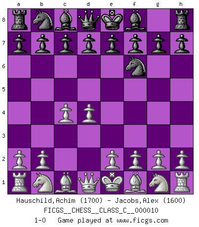 Last move : 1-0 2006 September 20 14:3:51 [Event "FICGS__CHESS__CLASS_C__000010"] [Site "FICGS"] [Date "2006.08.11"] [Round "1"] [White "Hauschild,Achim"] [Black "Jacobs,Alex"] [Result "1-0"] [WhiteElo "1700"] [BlackElo "1600"] 1.d4 Nf6 2.c4 1-0 This chess game has been lost on time (started : 2006.08.11 7:19:5) Queen's pawn game Player White won this chess game. Follow this game move after move (download)One bad move nullifies forty good ones. (Horowitz) Wir irren allesamt, nur jeder irrt anders. (Georg Christoph Lichtenberg) Tu eres para mi la Reina en d8 y yo soy el Peón en d7!!. (GM Eduard Gufeld) Pour se monter efficace, un Cavalier a besoin d'avant-postes ! Les Cavaliers font les meilleurs bloqueurs de pions passés. True nature is revealed in times of difficulty. (Chinese proverb)