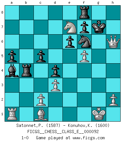 Last move : 1-0 2008 December 27 21:39:28 [Event "FICGS__CHESS__CLASS_E__000092"] [Site "FICGS"] [Date "2008.09.14"] [Round "1"] [White "Satonnet,Patrick"] [Black "Konuhov,Konstantin"] [Result "1-0"] [WhiteElo "1587"] [BlackElo "1600"] 1.e4 c5 2.f4 Nc6 3.Nf3 e6 4.Nc3 Nge7 5.Bb5 a6 6.Bxc6 Nxc6 7.O-O Be7 8.d3 d5 9.a4 O-O 10.b3 h6 11.Qe2 d4 12.Nd1 Bd7 13.Nf2 b5 14.e5 Nb4 15.Ne4 bxa4 16.bxa4 a5 17.g4 Nd5 18.Qg2 Rb8 19.g5 Kh8 20.Nh4 g6 21.Rf3 Rb4 22.Nf6 Bxa4 23.Rh3 Bxf6 24.Nxg6+ Kg8 25.gxf6 Qxf6 26.exf6 Nxf6 27.Ne7+ Kh7 28.Rxh6+ Kxh6 29.f5 Kh7 30.Qh3+ Kg7 31.Qh6+ 1-0 Sicilian : Grand Prix attack Kingside Castling by player White (move 7) Kingside Castling by player Black (move 9) Player White won this chess game. Follow this game move after move (download)The tactician knows what to do when there is something to do; whereas the strategian knows what to do when there is nothing to do. (Gerald Abrahams) Das Schachspiel übertrifft alle anderen Spiele so weit wie der Chimborasso einen Misthaufen. (Arthur Schopenhauer) Ayuda a tus piezas para que ellas te puedan ayudar. (Paul Morphy) Votre seul travail dans les ouvertures est d'obtenir un milieu de partie jouable. (Lajos Portish) An expert is a man who has made all the mistakes which can be made in a very narrow field. (Niels Bohr)