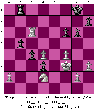 Last move : 1-0 2008 September 25 19:21:37 [Event "FICGS__CHESS__CLASS_E__000092"] [Site "FICGS"] [Date "2008.09.14"] [Round "1"] [White "Stoyanov,Zdravko"] [Black "Renault,Herve"] [Result "1-0"] [WhiteElo "1334"] [BlackElo "1254"] 1.e4 e5 2.h3 Nf6 3.d3 d5 4.Be2 dxe4 5.dxe4 Qxd1+ 6.Bxd1 Nxe4 7.Nf3 Nc6 8.c3 Bd6 9.Be3 O-O 10.O-O Bc5 11.Bxc5 Nxc5 12.Bc2 e4 13.Nfd2 Bf5 14.Re1 Rae8 15.b4 Nd3 16.Bxd3 exd3 17.Nf3 b5 18.Nbd2 a5 19.bxa5 Nxa5 20.Nd4 Rxe1+ 21.Rxe1 Bd7 22.Re3 c5 23.N4f3 c4 24.Re7 Bc6 25.Ne5 f6 26.Nxc6 Nxc6 27.Rb7 Rb8 28.Rc7 Ne5 29.f4 Nf7 30.Kf2 g6 31.Ke3 Nd6 32.Rc6 Nf5+ 33.Kf3 Nd4+ 34.cxd4 1-0 King's pawn game Kingside Castling by player Black (move 9) Kingside Castling by player White (move 10) Player White won this chess game. Follow this game move after move (download)Methodical thinking is of more use in Chess than inspiration. (C. J. S. Purdy) Schach sollte überall auf der Welt Schulfach werden. Es fördert die geistige Auseinandersetzung. Es lehrt die Demut in der Niederlage. (Garry Kasparov) Es el objetivo de la escuela moderna no tratar cada posición de acuerdo a una regla general, sino de acuerdo al principio inherente en la posición. (Richard Reti) C'est la seule position que je connaisse où les deux camps sont mals. Propos prêtés à V. Anand. Success without honor is an unseasoned dish; it will satisfy your hunger, but it won't taste good. (Joe Paterno)