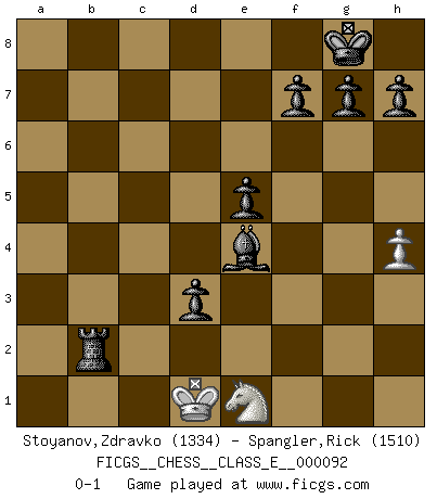 Last move : 0-1 2008 October 4 20:42:15 [Event "FICGS__CHESS__CLASS_E__000092"] [Site "FICGS"] [Date "2008.09.14"] [Round "1"] [White "Stoyanov,Zdravko"] [Black "Spangler,Rick"] [Result "0-1"] [WhiteElo "1334"] [BlackElo "1510"] 1.e4 Nf6 2.e5 Nd5 3.d4 d6 4.Qf3 dxe5 5.c4 Nb4 6.Na3 Qxd4 7.Qb3 e6 8.Nb5 Qe4+ 9.Kd1 N8a6 10.a3 c6 11.f3 Qh4 12.Nc3 Qd8+ 13.Bd2 Nc5 14.Qxb4 Nd3 15.Qb3 Nf2+ 16.Kc1 Nxh1 17.Be3 Be7 18.Be2 Bg5 19.Nd1 Bxe3+ 20.Qxe3 Qd4 21.Nh3 O-O 22.Kb1 b5 23.cxb5 cxb5 24.Ka2 Bb7 25.Bxb5 Bd5+ 26.b3 Rab8 27.a4 Rfc8 28.Qxd4 exd4 29.Nb2 Rc2 30.Rxh1 a6 31.Bxa6 Rxb3 32.Bb5 R3xb2+ 33.Ka1 Rxg2 34.Nf4 Ra2+ 35.Kb1 Rgb2+ 36.Kc1 Rxb5 37.Rd1 Rxa4 38.Nd3 Ra1+ 39.Kd2 Rxd1+ 40.Kxd1 Bxf3+ 41.Kd2 e5 42.Ne1 Be4 43.h4 Rb2+ 44.Kd1 d3 0-1 Alekhine's defense Kingside Castling by player Black (move 21) Player Black won this chess game. Follow this game move after move (download)By this measure (on the gap between Fischer & his contemporaries), I consider him the greatest world champion. (Garry Kasparov) Spielt Blackmar-Diemer-Gambit, und das Matt kommt von selbst! (Emil Joseph Diemer) Solo los afeminados hacen el Enroque. (Rob Sillars) Il n'y a pas de prix trop élevé au scalp de l'ennemi. (Koblentz) Don't be discouraged. It's often the last key in the bunch that opens the lock. (Author unknown)