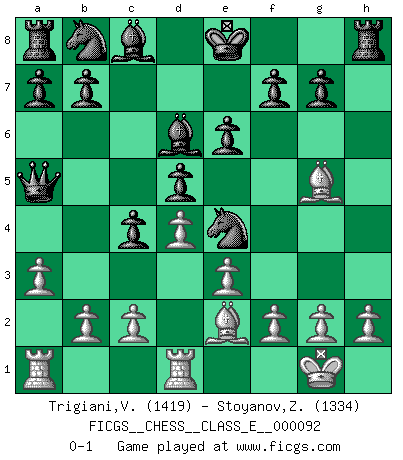 Last move : 0-1 2008 September 24 9:35:1 [Event "FICGS__CHESS__CLASS_E__000092"] [Site "FICGS"] [Date "2008.09.14"] [Round "1"] [White "Trigiani,Vincenzo"] [Black "Stoyanov,Zdravko"] [Result "0-1"] [WhiteElo "1419"] [BlackElo "1334"] 1.d4 c6 2.Nc3 e6 3.Bf4 d5 4.Nf3 c5 5.Nb5 Qa5+ 6.Nc3 c4 7.Qd2 Bb4 8.e3 Nf6 9.Ng5 h6 10.Be2 hxg5 11.Bxg5 Ne4 12.Qd1 Nxc3 13.Qd2 Ne4 14.O-O Nxd2 15.Rfd1 Ne4 16.a3 Bd6 0-1 Queen's pawn Kingside Castling by player White (move 14) Player Black won this chess game. Follow this game move after move (download)The defensive power of a pinned piece is only imaginary. (Aaron Nimzovich) Wenn man heute mit 14 Jahren noch kein GM ist, kann man es vergessen. (Viswanathan Anand) Los asuntos humanos son como una partida de Ajedrez: solo aquellos que no lo toman seriamente, pueden ser llamados buenos jugadores. (Hung Tzu Ch'eng) Le génie consiste à savoir transgresser les règles au moment opportun. (Teichmann) Employ the attack like tactic of defense. (Chinese proverb)
