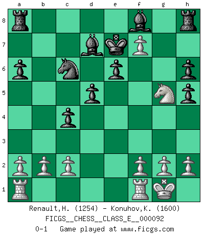 Last move : 0-1 2008 October 21 14:0:29 [Event "FICGS__CHESS__CLASS_E__000092"] [Site "FICGS"] [Date "2008.09.14"] [Round "1"] [White "Renault,Herve"] [Black "Konuhov,Konstantin"] [Result "0-1"] [WhiteElo "1254"] [BlackElo "1600"] 1.e4 c5 2.Nf3 Nc6 3.d4 cxd4 4.Nxd4 Nf6 5.Nc3 d6 6.Bb5 Bd7 7.O-O a6 8.Bc4 e6 9.Bg5 b5 10.Nxe6 fxe6 11.Bxf6 Qxf6 12.Qh5+ g6 13.e5 gxh5 14.exf6 bxc4 15.Ne4 d5 16.Ng5 h6 17.f7+ Ke7 0-1 Sicilian defense Kingside Castling by player White (move 7) Player Black won this chess game. Follow this game move after move (download)The winner of the game is the player who makes the next-to-last mistake. (Savielly Tartakover) Mit Schach schule ich mein Gefühl für Geometrie, was für Tennis und Schach gleichermaßen wichtig ist. (Boris Becker) Vive, pierde y aprende al observar a tu oponente como ganar. (Amber Steenbock) Toutes choses étant égales, c'est la conviction qui gagne. Alliée à une volonté de vaincre, elle sert de détonateur, suscite des idées, disperse les doutes et aide à penser clairement. (Robert Fischer) There will be no order, only chaos. (Sol Robeson in Pi by Darren Aronofsky)
