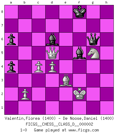 Last move : 1-0 2007 April 26 0:45:31 [Event "FICGS__CHESS__CLASS_D__000002"] [Site "FICGS"] [Date "2006.04.15"] [Round "1"] [White "Valentin,Florea"] [Black "De Noose,Daniel"] [Result "1-0"] [WhiteElo "1400"] [BlackElo "1400"] 1.e4 e5 2.Nf3 Nc6 3.Bb5 a6 4.Ba4 Nf6 5.O-O Be7 6.Re1 b5 7.Bb3 O-O 8.c3 d5 9.exd5 Nxd5 10.Nxe5 Nxe5 11.Rxe5 c6 12.d4 Bd6 13.Re1 Qh4 14.g3 Qh3 15.Bxd5 cxd5 16.Qf3 Bf5 17.Qxd5 Rae8 18.Bd2 Rxe1+ 19.Bxe1 Re8 20.Nd2 Re6 21.a4 bxa4 22.Qg2 Qh6 23.Nc4 Be4 24.f3 Bd3 25.Bd2 g5 26.Ne3 Qf8 27.Re1 Qe8 28.Bc1 Qb5 29.Qd2 f6 30.Ng4 Rxe1+ 31.Qxe1 Kf7 32.Nf2 Be2 33.Ne4 Be7 34.Kf2 Bc4 35.g4 h6 36.Ng3 Qb3 37.Nf5 Bf8 38.Qd2 Qb5 39.h3 Bf1 40.h4 Bd3 41.hxg5 hxg5 42.Ng3 Bc4 43.f4 Be6 44.fxg5 fxg5 45.Ne4 Bxg4 46.Kg3 Bc8 47.Nxg5+ Kg8 48.Qf4 Qd3+ 49.Be3 Qg6 50.Qe4 Bd6+ 51.Kf2 Bf5 52.Qd5+ Kf8 53.c4 1-0 Ruy Lopez : Closed, 7...O-O Kingside Castling by player White (move 5) Kingside Castling by player Black (move 7) Player White won this chess game. Follow this game move after move (download)Later, I began to succeed in decisive games. Perhaps because I realized a very simple truth: not only was I worried, but also my opponent. (Mikhail Tal) Es liegt in der Natur, vernüftig zu denken und unlogisch zu handeln. (Anatole France) El Ajedrez es parte de una cultura y si una cultura esta en decadencia, entonces también el Ajedrez declinará. (Mikhail Botvinnik) Un millionnaire : 'Monsieur Steinitz ! Vous ne participez aux tournois que pour l'argent, alors que moi je n'y viens que pour l'honneur.' Steinitz : 'Chacun joue pour ce qu'il n'a pas'... Unless I accept my faults I will most certainly doubt my virtues. (Hugh Prather)