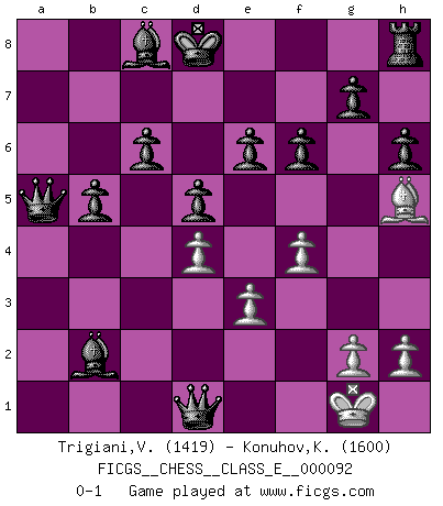 Last move : 0-1 2008 November 16 10:58:0 [Event "FICGS__CHESS__CLASS_E__000092"] [Site "FICGS"] [Date "2008.09.14"] [Round "1"] [White "Trigiani,Vincenzo"] [Black "Konuhov,Konstantin"] [Result "0-1"] [WhiteElo "1419"] [BlackElo "1600"] 1.d4 Nf6 2.Nc3 d5 3.Bf4 c6 4.Nf3 h6 5.e3 Qb6 6.Na4 Qa5+ 7.c3 Nbd7 8.b3 b5 9.b4 Qxa4 10.Qc1 a5 11.Bd3 axb4 12.O-O Qa3 13.Qd1 bxc3 14.Ne5 Nxe5 15.Bxe5 e6 16.f4 Ne4 17.Be2 f6 18.Bc7 Qa7 19.Bg4 Qxc7 20.Qc1 Ba3 21.Bh5+ Kd8 22.Qc2 Bb2 23.Rab1 Rxa2 24.Qb3 Qa5 25.Qc2 Nd2 26.Rf3 Nxb1 27.Qxb1 Ra1 28.Rf1 Rxb1 29.Rxb1 c2 30.Rd1 cxd1Q+ 0-1 Queen's pawn game Kingside Castling by player White (move 12) Promotion Queen by player Black (move 30) Player Black won this chess game. Follow this game move after move (download)Chess is like life. (Boris Spassky) Als er Schachweltmeister wurde ließ er praktisch alle stärksten Sovietspieler für sich arbeiten. Wenn ein auch nur mittelmässiger Meister ein Spezialist für eine bestimmte Eröffnung war, wurde er von Karpov gerufen. Das wurde alles geheim gehalten. (Mikhail Moiseyevich Botvinik) El hombre es un frívolo, una creatura engañosa y como un jugador de Ajedrez, se preocupa mas por el proceso de obtener su meta que de la meta por sí misma. (Dostoyevsky) J'ai vu le vaincu d'Echecs jouer des années durant dans l'espoir de la fête de la victoire. Car tu es plus riche de ce qu'elle existe si même elle n'est point pour toi. Ainsi de la perle du fond des mers. (Antoine de Saint-Exupéry) The real danger is not that computers will begin to think like men, but that men will begin to think like computers. (Sydney J. Harris)