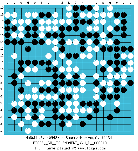 Last move : 1-0 2009 February 7 17:40:13 [Event "FICGS__GO__TOURNAMENT_KYU_I__000010"] [Site "FICGS"] [Date "2008.09.15"] [Round "1"] [Black "McNabb,Sean"] [White "Suarez-Moreno,Alejandro"] [Result "1-0"] [Rating 1 "0943"] [Rating 2 "1134"] 1.r16 d4 2.q3 d17 3.d15 c15 4.c14 c16 5.d13 p17 6.m17 p15 7.r13 n16 8.j16 r5 9.r8 p5 10.n3 l4 11.n5 n4 12.o4 m4 13.o5 d8 14.c10 f16 15.b8 c6 16.r4 o7 17.p6 o6 18.q6 m7 19.h4 j4 20.h3 f3 21.j5 k5 22.j3 k4 23.h5 k17 24.k16 j17 25.l16 h16 26.h15 g16 27.j14 g8 28.j8 j7 29.h7 k7 30.h8 h6 31.j6 g6 32.k6 l6 33.m5 l5 34.k8 l7 35.g7 f8 36.g5 f6 37.f5 e6 38.c4 c5 39.e4 d3 40.e3 e2 41.d2 c2 42.f2 d1 43.g2 f4 44.e5 b12 45.b14 c9 46.b9 d10 47.c11 j10 48.k10 k11 49.h10 h11 50.j9 l10 51.j11 j12 52.g11 j10 53.g10 g12 54.j11 k2 55.k3 j10 56.f7 e7 57.j11 l3 58.j2 j10 59.d11 q10 60.p13 r17 61.s17 q16 62.r18 q18 63.s18 r15 64.s16 q14 65.q13 k9 66.f11 q7 67.r7 q8 68.r6 r9 69.s15 s12 70.s13 n14 71.m14 n13 72.m13 m12 73.n17 o17 74.f14 o11 75.q11 p11 76.r11 s10 77.s11 s8 78.s7 t11 79.r12 t12 80.t13 t10 81.c7 d6 82.b4 b5 83.d5 b3 84.p7 p8 85.l8 m8 86.l9 m9 87.h9 k10 88.a17 a16 89.b16 b17 90.a15 b15 91.a16 a18 92.a14 b18 93.d16 c17 94.r10 m18 95.l18 n18 96.l17 k19 97.p10 q9 98.o8 o9 99.m19 o19 100.l19 k18 101.g18 g17 102.e17 e18 103.e16 f17 104.t8 s9 105.m2 e10 106.e11 g14 107.f18 d18 108.g15 f15 109.e15 h17 110.e14 h14 111.j15 h18 112.j13 h13 113.l12 n12 114.k12 l14 115.o18 p18 116.n19 o18 117.m15 k14 118.n15 p14 119.o15 o16 120.o14 o13 121.r14 q19 122.q15 1-0 Here are the names of the openings (joseki) played in the four corners : Corner d16 : d17 d15 Komoku (Somok, Xiao~mu`) 3-4 Point. The komoku (3-4) point is the traditional corner enclosure move.. Ikken Takagakari (Hankan Nop'dakeolch'im, Yi Gaogua`jiao~, 1-Space High Approach). The 5-4 approach move has become more popular in modern times, as modern Go emphasizes speed and influence. Corner q16 : r16 p17 Komoku (Somok, Xiao~mu`) 3-4 Point. The komoku (3-4) point is the traditional corner enclosure move.. Ikken Kakari (Hankan Keolch'im, Yi Gua`jiao~, 1-Space Low Pincer). The small knight move is the basic approach move to the 3-4 point stone. It has been continually used for over four centuries. There are limitless variations, with new moves constantly being discovered. White 2 opens the door to a treaure store of joseki. Corner q4 : q3 r5 Komoku (Somok, Xiao~mu`) 3-4 Point. The komoku (3-4) point is the traditional corner enclosure move.. Ikken Kakari (Hankan Keolch'im, Yi Gua`jiao~, 1-Space Low Pincer). The small knight move is the basic approach move to the 3-4 point stone. It has been continually used for over four centuries. There are limitless variations, with new moves constantly being discovered. White 2 opens the door to a treaure store of joseki. Player Black won this Go (weiqi, baduk) game. Follow this game move after move (download)Beginner's games are surprising, often incoherent and incomprehensible. When you improve, your game gains in consistency but flirts with stupidity: you become satisfied with truisms and mechanical movements, you try to obtain a feeling for clearness and style the easy way. (Pierre Audouard) History is a gallery of pictures in which there are few originals and many copies. (Alexis de Tocqueville)