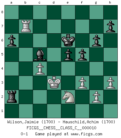 Last move : 0-1 2006 October 25 18:1:15 [Event "FICGS__CHESS__CLASS_C__000010"] [Site "FICGS"] [Date "2006.08.11"] [Round "1"] [White "Wilson,Jaimie"] [Black "Hauschild,Achim"] [Result "0-1"] [WhiteElo "1700"] [BlackElo "1700"] 1.e4 c5 2.Nf3 Nc6 3.d4 cxd4 4.Nxd4 Nf6 5.Nc3 e5 6.Ndb5 d6 7.Bg5 a6 8.Na3 b5 9.Nd5 Be7 10.Bxf6 Bxf6 11.c3 O-O 12.Nc2 Rb8 13.Be2 Bg5 14.O-O Ne7 15.Nce3 Bb7 16.Nxe7+ Qxe7 17.Nf5 Qf6 18.Qxd6 Bxe4 19.Qxf6 Bxf6 20.Ng3 Bc6 21.Rfd1 Rfd8 22.h3 g6 23.Bd3 Be7 24.Be4 Bxe4 25.Nxe4 f5 26.Ng3 Kf7 27.Kf1 Rbc8 28.Ke2 b4 29.Rxd8 Bxd8 30.Rc1 Rc5 31.c4 Ra5 32.Ra1 Bb6 33.a4 Bd4 34.Ra2 b3 35.Ra3 Bxb2 36.Rxb3 Bd4 37.f3 Rxa4 38.Kd3 Bc5 39.Ne2 Ra2 40.Rb7+ Ke6 0-1 Sicilian : Pelikan (Lasker/Sveshnikov) variation Kingside Castling by player Black (move 11) Kingside Castling by player White (move 14) Player Black won this chess game. Follow this game move after move (download)Human affairs are like a Chess game: only those who do not take it seriously can be called good players. (Hung Tzu Ch'eng) Kombinieren und Schwarzhandel gehören verboten. (Savielly Grigorievitsch Tartakower) Yo no creo en la psicología. Yo creo en las buenas movidas. (Bobby Fischer) Le profane ne songe pas à la somme de jouissance dont il se prive, qui méconnaît ce jeu aux ressources aussi variées que passionnantes. (Jean-Marie Jeanton-Lamarche) Being number two sucks. (Andre Agassi)
