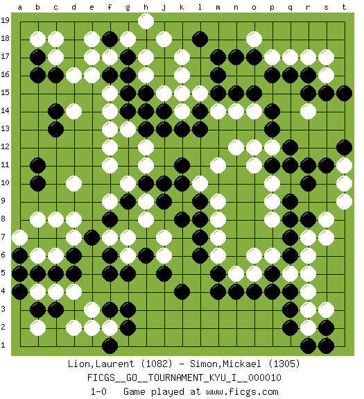Last move : 1-0 2009 January 4 23:59:24 [Event "FICGS__GO__TOURNAMENT_KYU_I__000010"] [Site "FICGS"] [Date "2008.09.15"] [Round "1"] [Black "Lion,Laurent"] [White "Simon,Mickael"] [Result "1-0"] [Rating 1 "1082"] [Rating 2 "1305"] 1.q16 d4 2.q3 d16 3.f3 c6 4.k4 r5 5.p5 r3 6.q4 r4 7.q7 s7 8.f5 d10 9.f16 f15 10.g15 f14 11.g17 e16 12.m17 r14 13.r11 r17 14.r16 q17 15.p16 p17 16.o17 o18 17.n17 s16 18.s15 s17 19.r15 o16 20.o15 n16 21.m15 h16 22.h15 j15 23.j16 k16 24.j17 k17 25.j14 k15 26.h13 h17 27.g16 j18 28.l18 k14 29.k13 g18 30.l13 m14 31.l14 l15 32.m16 n14 33.n15 n12 34.p11 m11 35.k11 l10 36.k10 k9 37.l9 m9 38.l8 m8 39.l7 p9 40.r8 s8 41.r10 m7 42.l6 m6 43.m5 n5 44.m4 o6 45.n4 p6 46.q6 o5 47.o4 q5 48.p4 r7 49.q9 p8 50.q8 p10 51.p13 o14 52.p14 o12 53.j9 d2 54.e7 c8 55.b16 c17 56.c13 d14 57.b17 b18 58.b11 g13 59.g12 f12 60.g11 f11 61.f18 h19 62.b10 e18 63.b7 b8 64.c7 d7 65.d6 d8 66.c5 b6 67.b5 a7 68.d5 f2 69.g2 e3 70.f1 e2 71.g3 c4 72.b3 b2 73.c3 b4 74.a4 a5 75.a6 e17 76.a5 h14 77.g14 f13 78.q2 f17 79.h14 h12 80.j13 h11 81.h10 g10 82.s2 r2 83.r1 s3 84.s1 t11 85.s11 t10 86.t12 t9 87.t15 g7 88.f8 h8 89.g9 h9 90.j10 f9 91.h6 g6 92.g5 j6 93.j5 j7 94.k8 p12 95.q12 o11 96.q11 r6 97.f6 f7 98.c16 c18 99.c14 1-0 Here are the names of the openings (joseki) played in the four corners : Corner d4 : d4 f3 Hoshi (Hwajeom, Seongjeom, Xingwei`) 4-4 Point. The star or hoshi (4-4) point, emphasizing influence at the potential expense of territory. Ikken Kakari (Hankan Keolch'im, Yi Gua`jiao~, 1-Space Low Approach). Black 2 is the standard approach move to the 4-4. Corner q4 : q3 r5 Komoku (Somok, Xiao~mu`) 3-4 Point. The komoku (3-4) point is the traditional corner enclosure move.. Ikken Kakari (Hankan Keolch'im, Yi Gua`jiao~, 1-Space Low Pincer). The small knight move is the basic approach move to the 3-4 point stone. It has been continually used for over four centuries. There are limitless variations, with new moves constantly being discovered. White 2 opens the door to a treaure store of joseki. Corner d16 : d16 f16 Hoshi (Hwajeom, Seongjeom, Xingwei`) 4-4 Point. The star or hoshi (4-4) point, emphasizing influence at the potential expense of territory. Ikken Takagakari (Hankan Nop'dakeolch'im, Yi Gaojia, 1-Space High Approach). White typically responds at 6-4 or 3-10. White 4-10 is played when White finds play on the right side advantageous. White 4-8 or 3-8 may be played when White has support at top. Player Black won this Go (weiqi, baduk) game. Follow this game move after move (download)The monkey jump is worth eight points. (Anonymous) If you lose the game you should win the analysis! (Proverb)